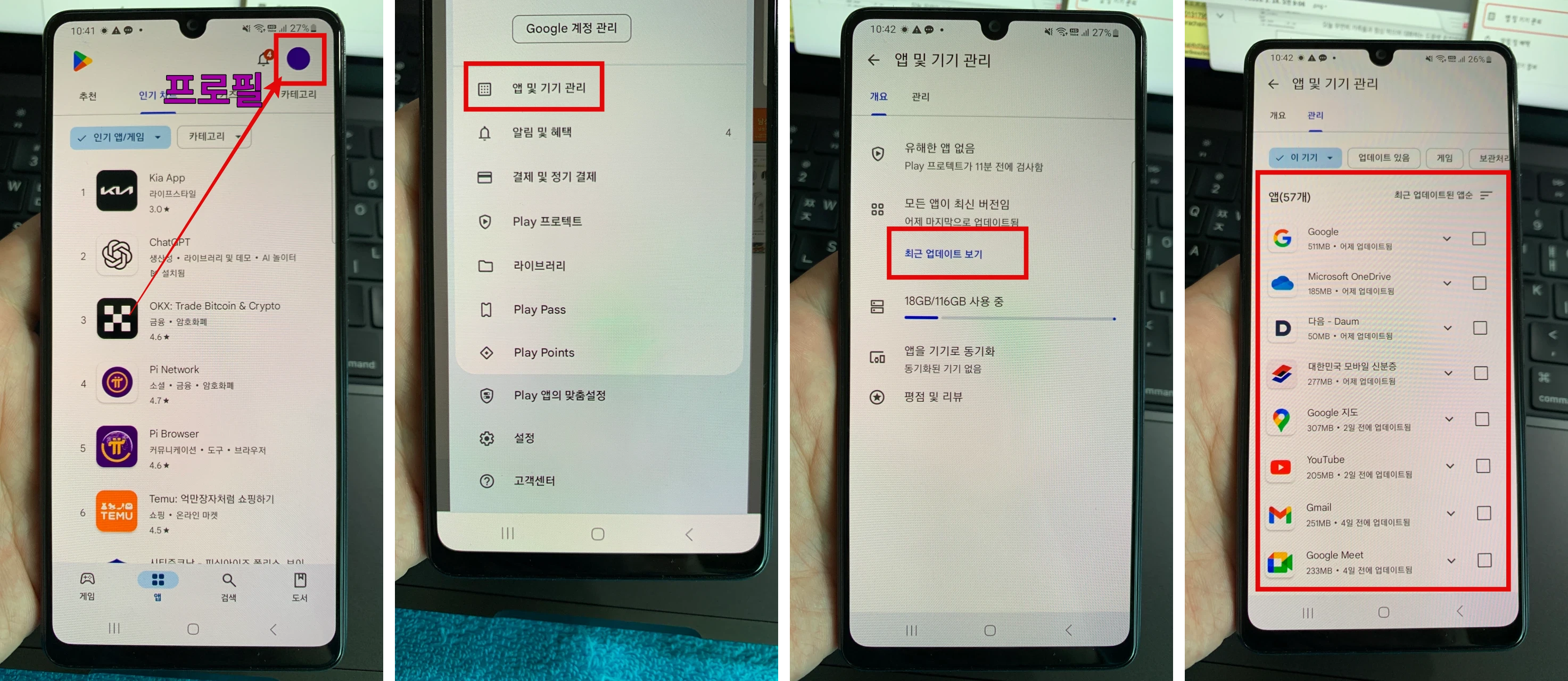 내 폰의 앱들이 잘 업데이트되고 있는지 확인하거나 업데이트 알림을 받지 못했을 경우 수동으로 아래와 같이 앱 업데이트 확인을 직접 하실 수 있습니다.
