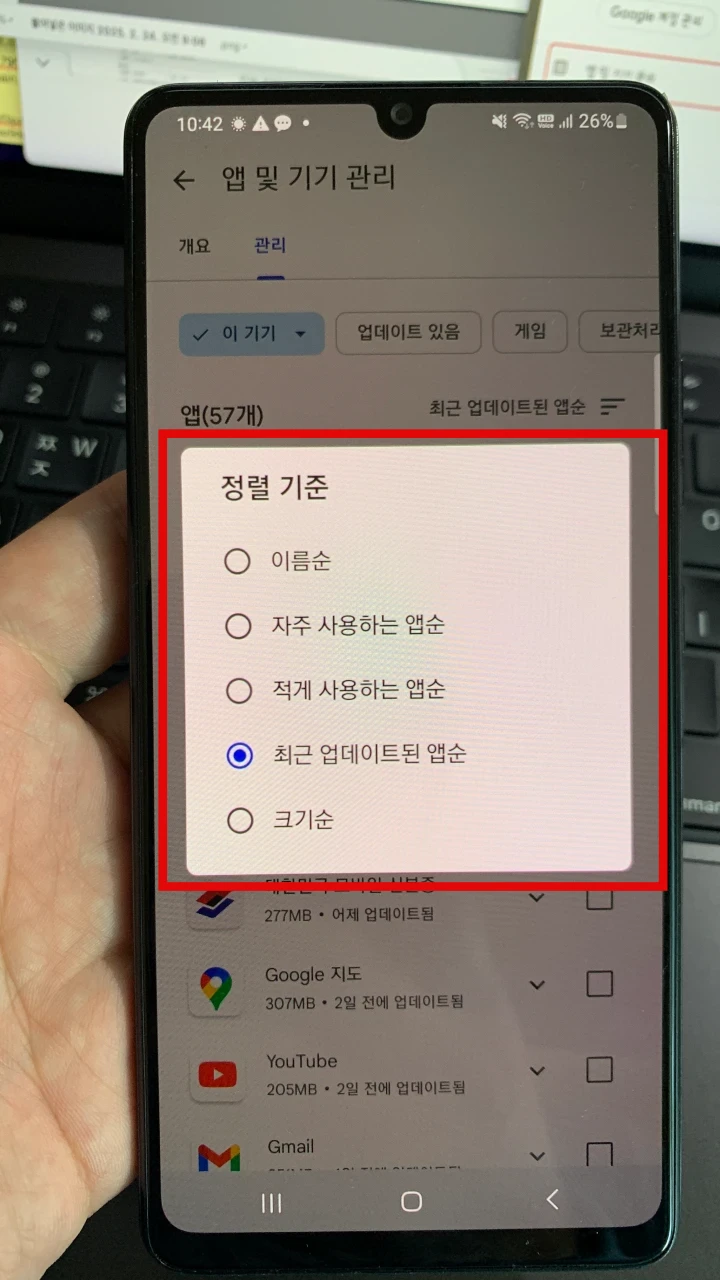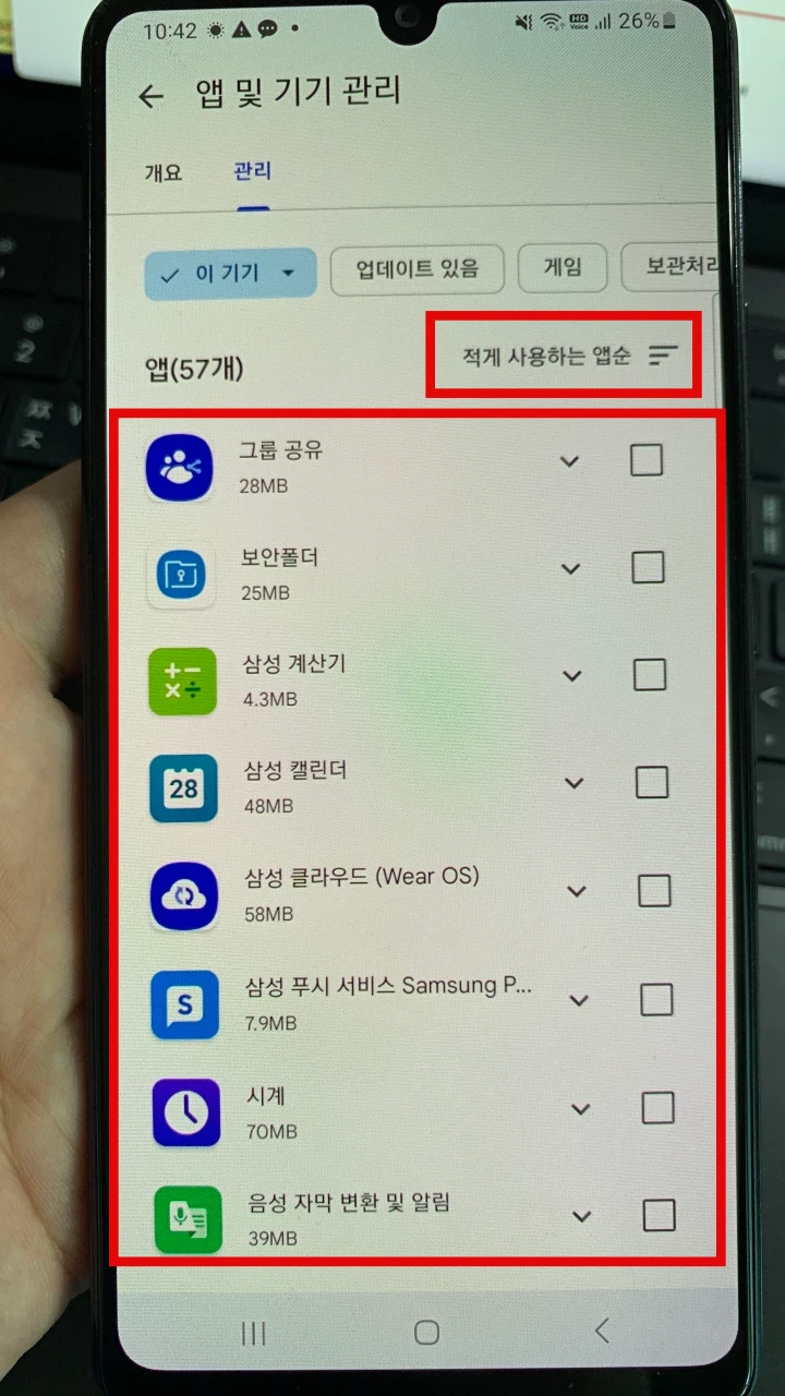 앱을 정렬해서 보는 것인데요. 적게 사용하는 앱순으로 정렬을 해서 보면 지금까지 한 번도 사용하지 않은 앱이 나의 스마트폰 저장공간을 차지하는 경우가 있을 수 있으니 이를 활용해 보세요. ~ ^^
