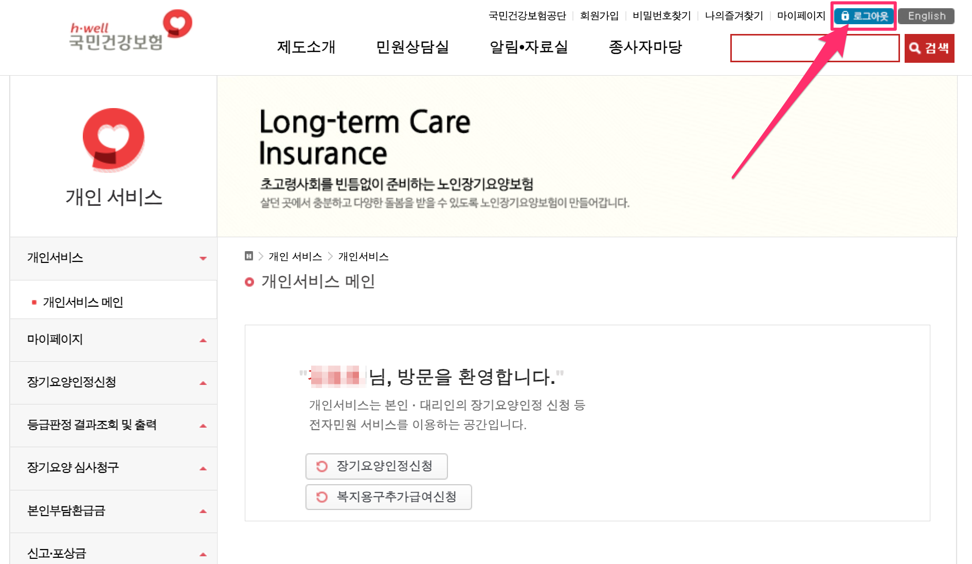그리고 아래에 표시한대로 '장기요양인정신청' 버튼을 눌러 주세요.