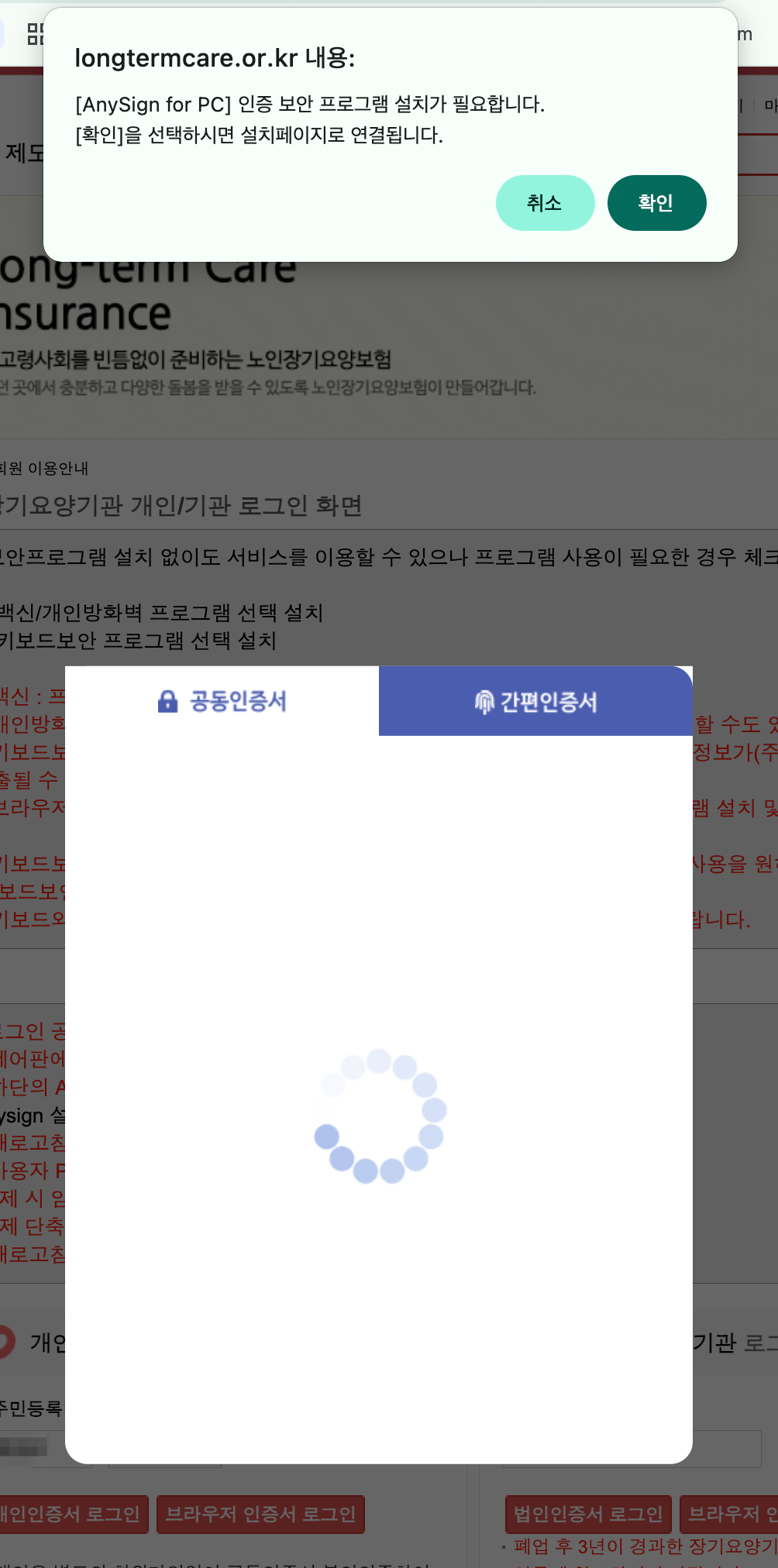 국민건강보험공단 장기요양기관 개인인증서 pc 로그인 무한 오류