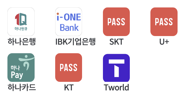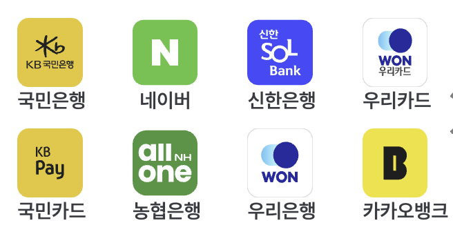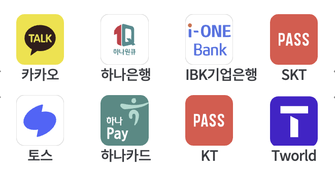 국민은행, 네이버, 신한은행, 우리카드, 국민카드, 농협은행, 우리은행, 카카오뱅크, 토스, 하나은행, IBK기업은행, 하나카드, KT패스, SKT패스, LGU+ 패스, 티월드 등이 있습니다.