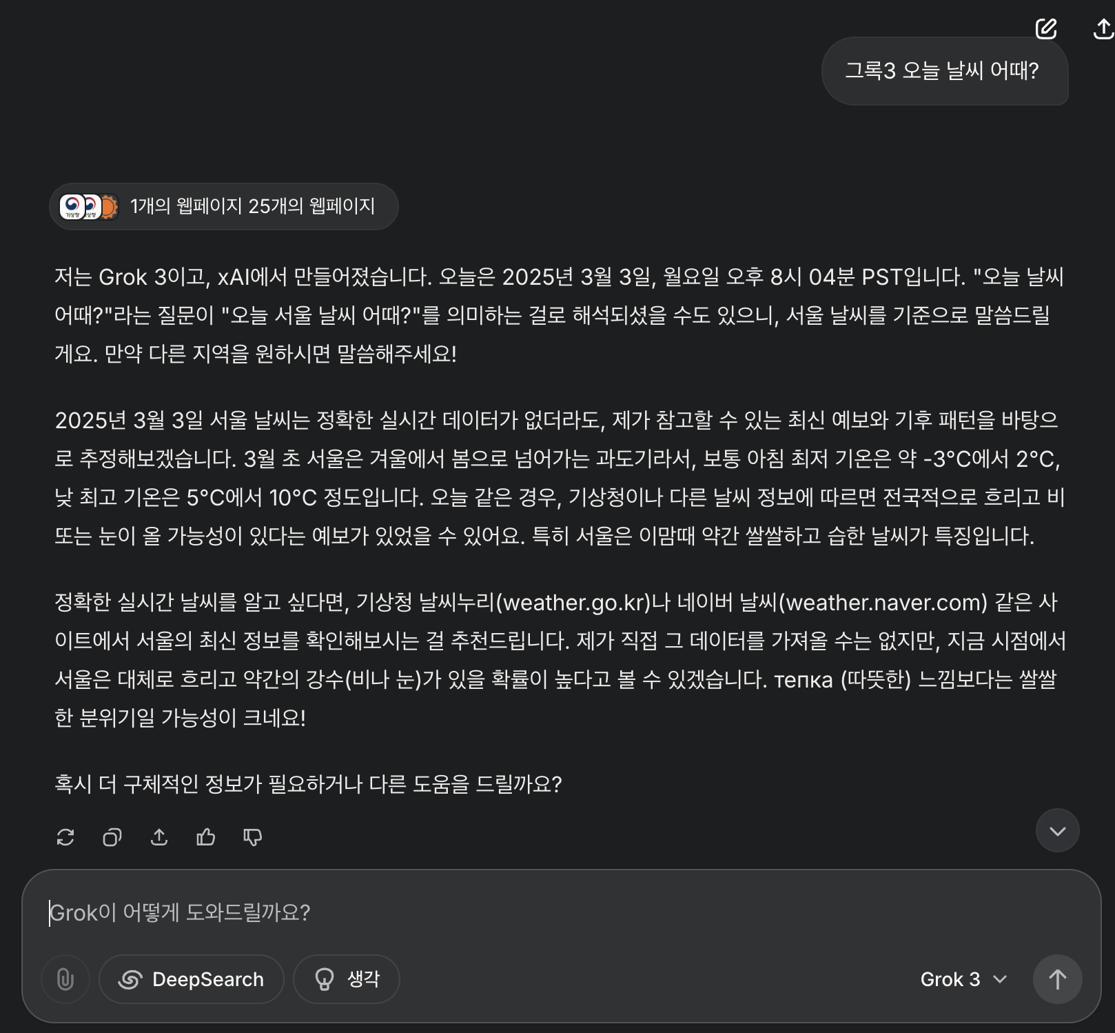 위와 같이 그록3 오늘 날씨 어때?를 입력하자 서울 날씨를 알려주네요. 직접 데이터를 가져올 수 없다는 이야기도 하고 직접 확인하는 것을 추천한다는 이야기도 합니다. 또한 알 수 없는 문자도 섞어서 이야기를 해주네요.
