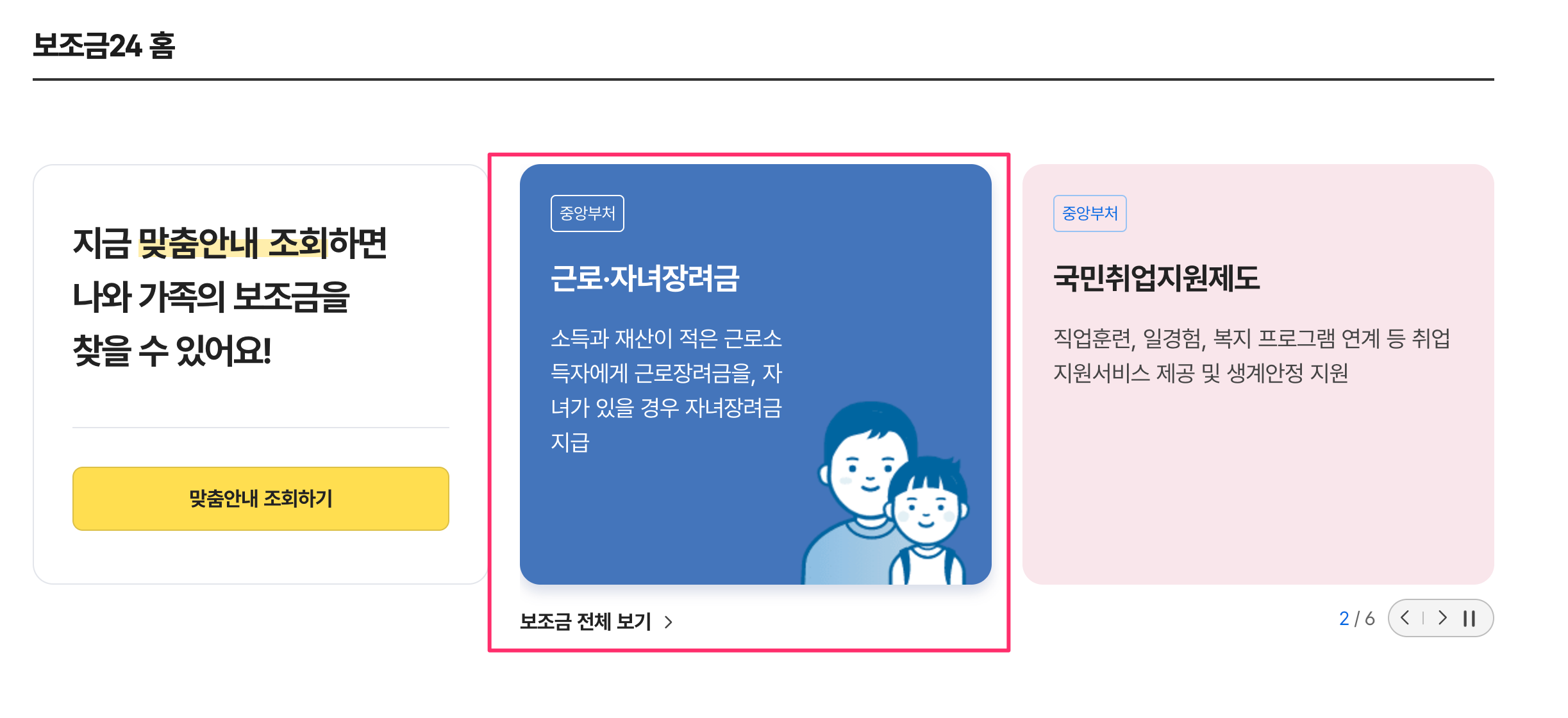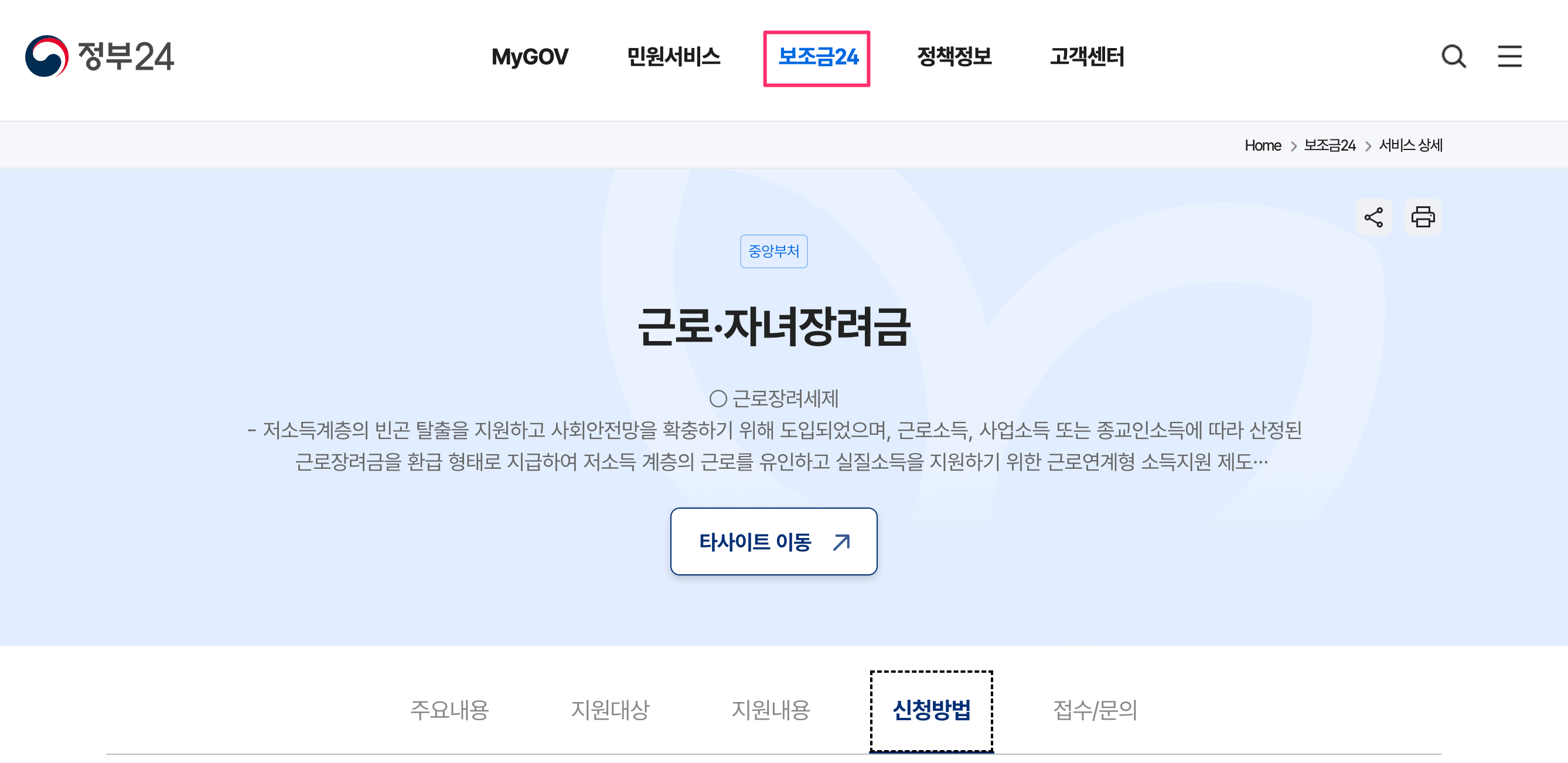- [보조금24]에서 신청 가능 여부 확인하시면, '근로자녀장려금'을 눌러보시면 되세요.