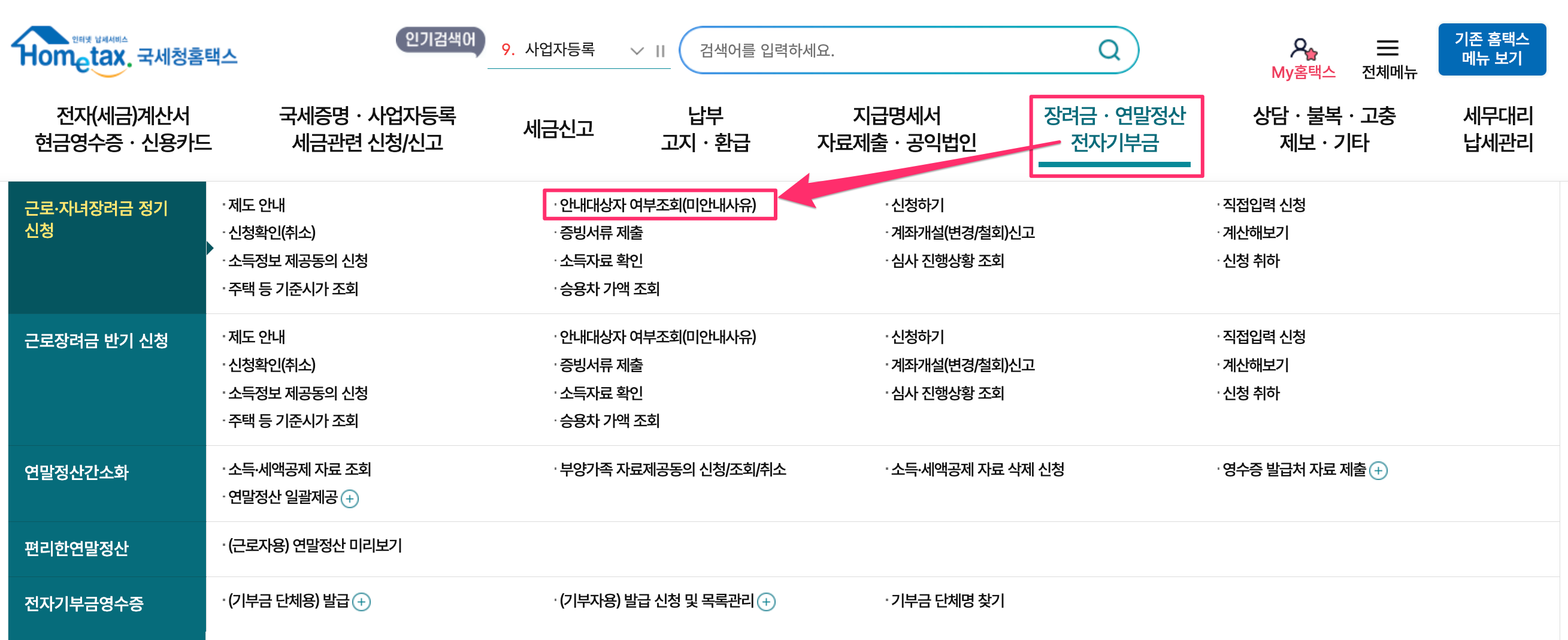 2. 로그인 후 [장려금 연말 정산 전자기부금 > 안내대상자 여부조회(미안내사유)] 클릭