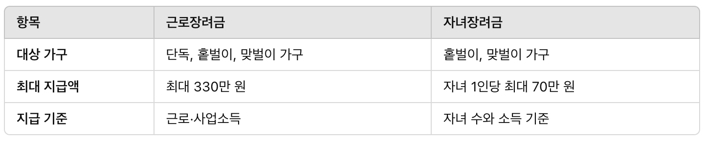 아래는 근로장려금과 자녀장려금의 차이를 간단히 표로 정리해 보았습니다.