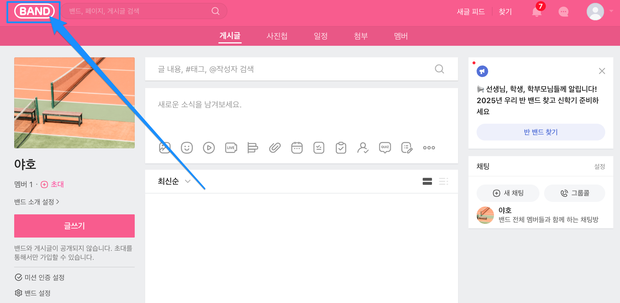 1. 좌상단에 "BAND"라고 적힌 것을 눌러 주세요.