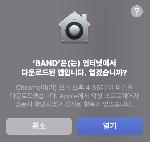 네이버 밴드 PC버전 아이콘을 잡고 Applications라는 곳으로 드래그&드랍을 해주면 설치가 진행됩니다. 그리고 설치 완료 후 실행을 했더니 아래와 같이 인터넷 연결 여부를 묻는 팝업과 내용이 보입니다. '열기'를 눌러 실행을 시작해 줍니다.