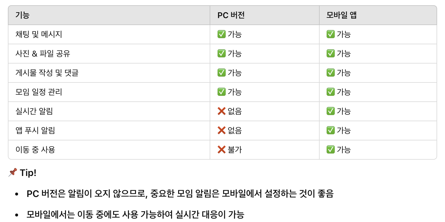 이렇게 2 버전 모두 설치를 했다면 동일하다고 생각하실 수 있을 듯해요. 하지만 살짝 차이가 있다는 것 알아두세요. 채팅 및 메시지, 사진&파일공유, 게시물 작성 및 댓글, 모임 일정 관리 등을 모두 가능하지만요, 실시간 알림, 앱 푸시 알림, 이동 중 사용은 모바일앱만 가능해요.