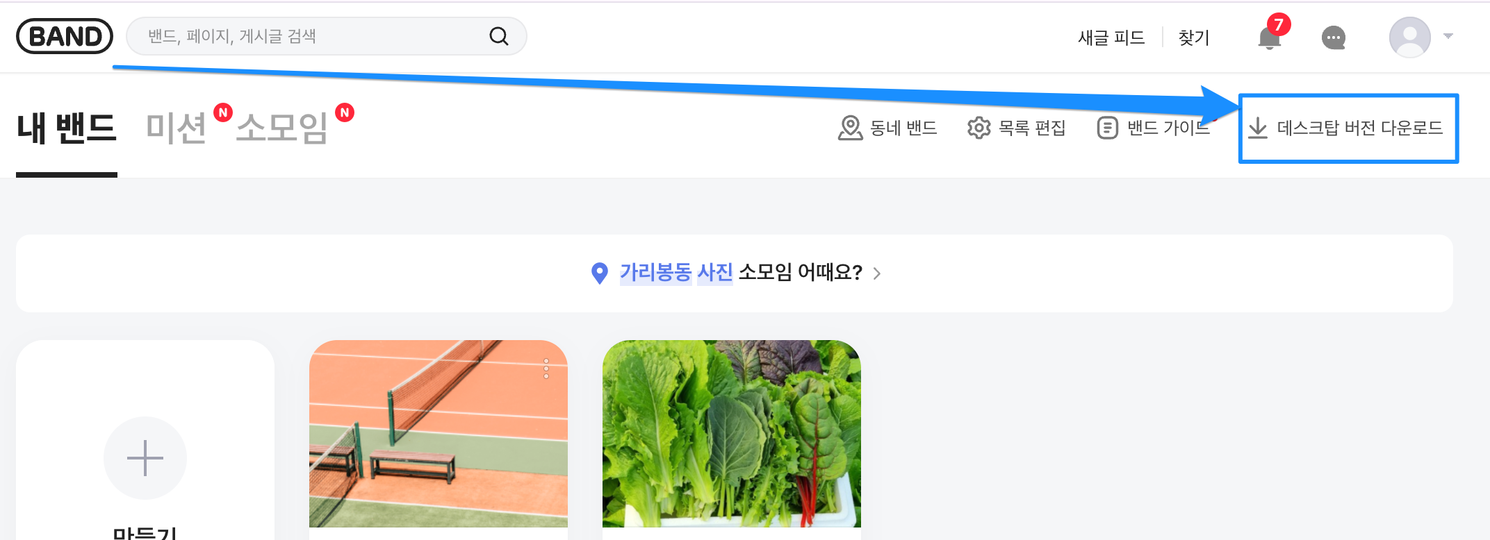 2. 밴드 홈에서 우측에 있는 '데스크탑 버전 다운로드'가 보이면 성공입니다.