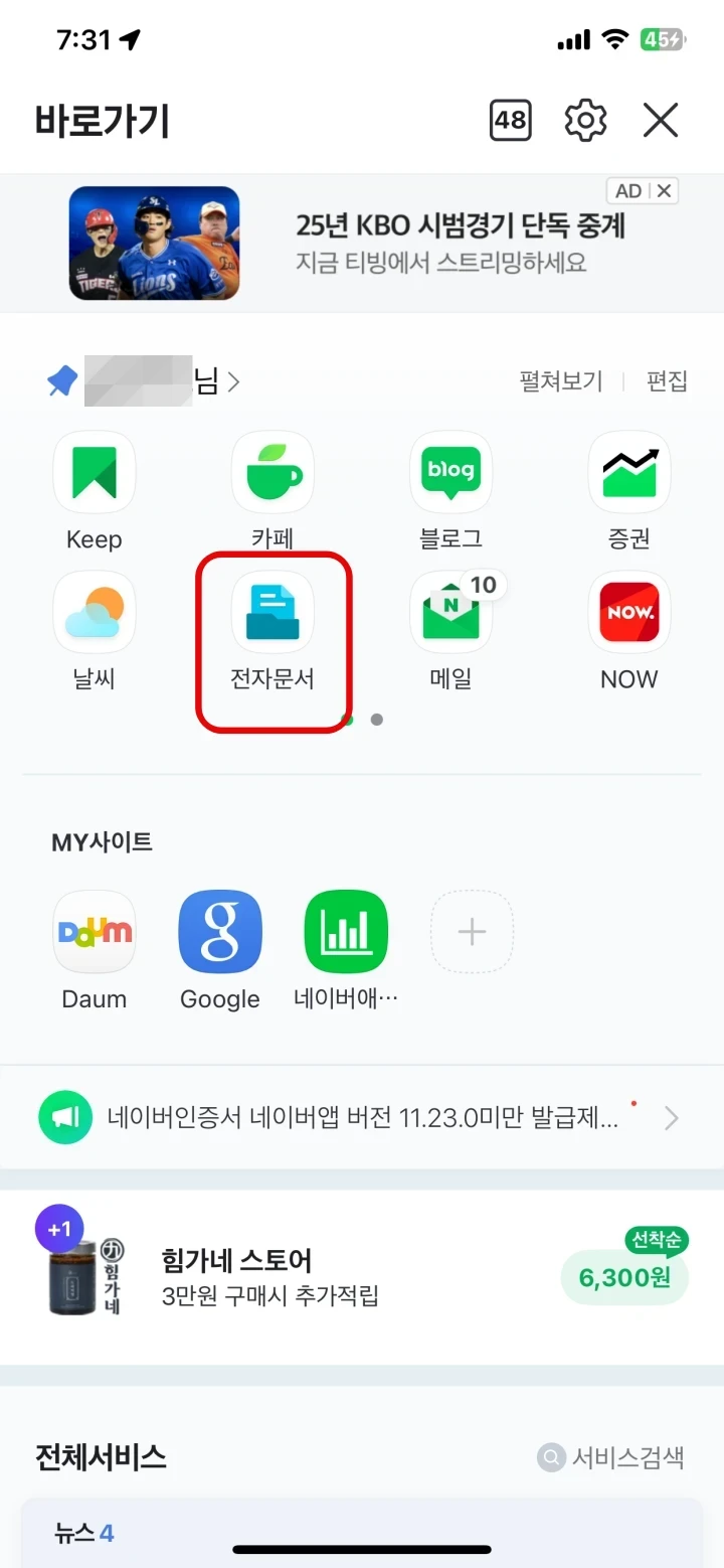 네이버 앱 서비스에서 전자문서를 찾는 다른방법 열기~