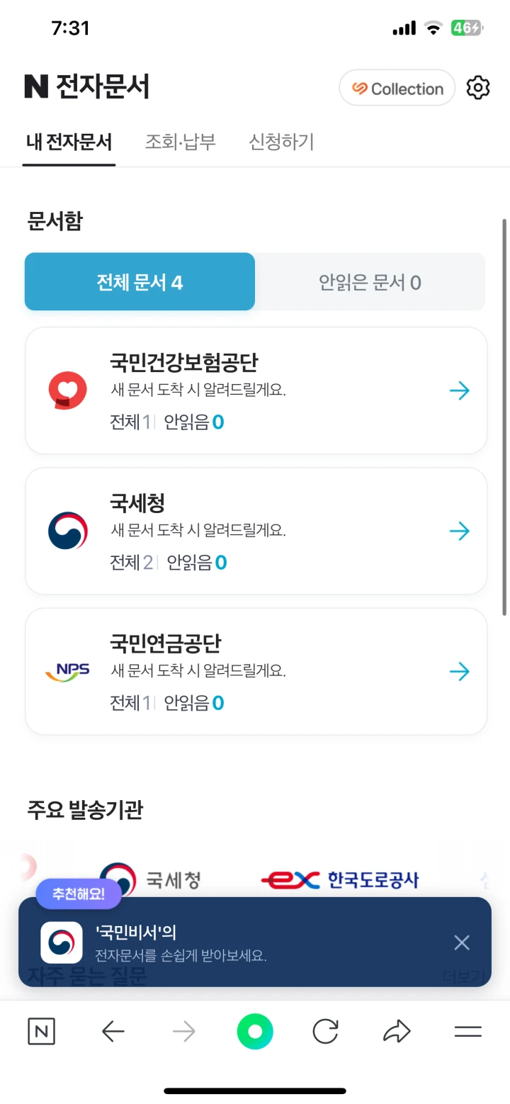 그래서, 저도 네이버 앱으로 국민건강보험공단, 국세청, 국민연금공단 등을 포함하는 다양한 전자문서를 받아보고 있습니다. 물론 모든 문서를 다 받아보지는 않고 우선적으로 필요한 것만이요.