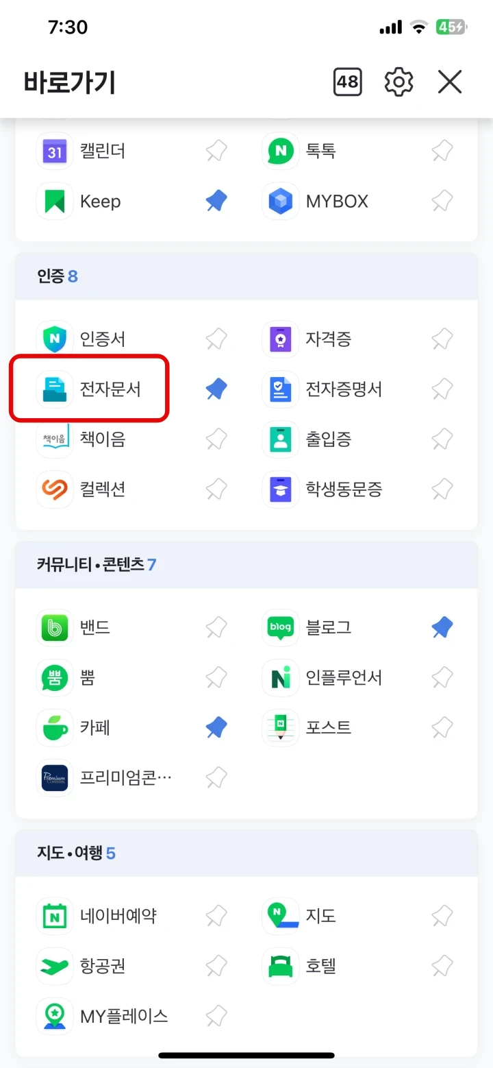 네이버 앱 전자문서 즐겨찾기 바로가기