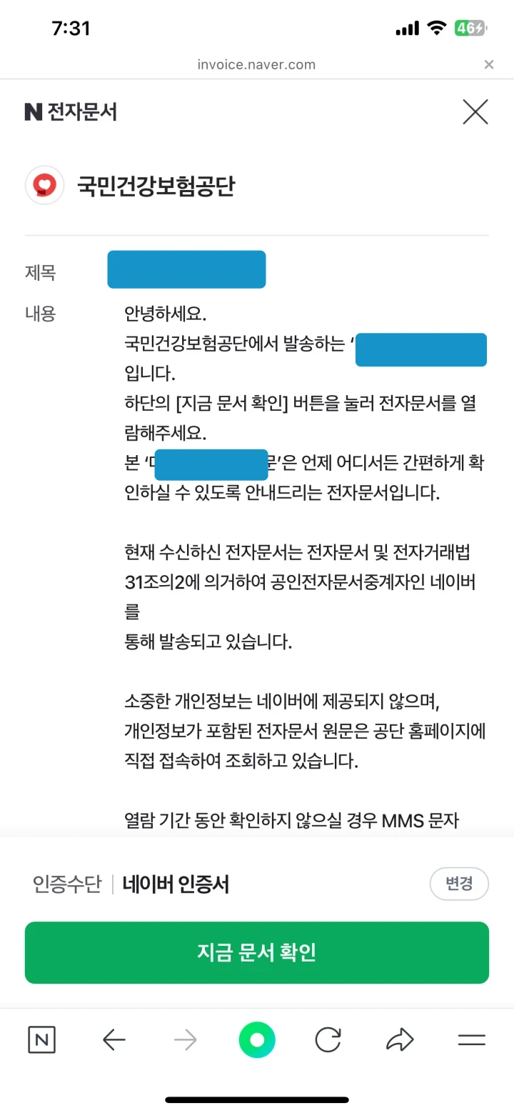 국민건강보험공단에서 저의 건강에 대한 정보를 열람하라고 해서 전자문서 열람을 네이버 앱을 통해서 해봤습니다. 개인 정보 보호를 위한 작업이 확실하다는 것이 느껴지더라고요.