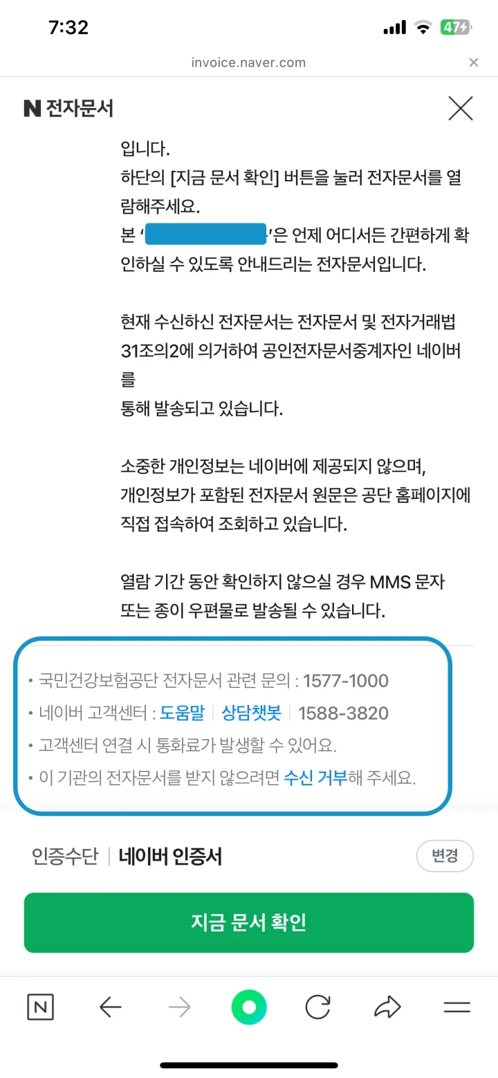 물론, 다른 방법으로 볼 수 있는 방법이 있기는 하지만 조금은 불편하니 정해진 기한 내에 네이버 앱에서 전자문서 열람을 간편하게 하시기 바랍니다.