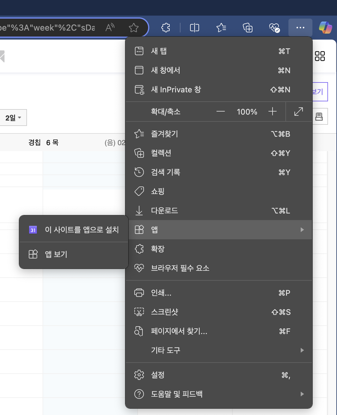 2. 우상단 삼점(전체메뉴)을 눌러 [앱 > 이 사이트를 앱으로 설치]를 순서대로 눌러 주세요.