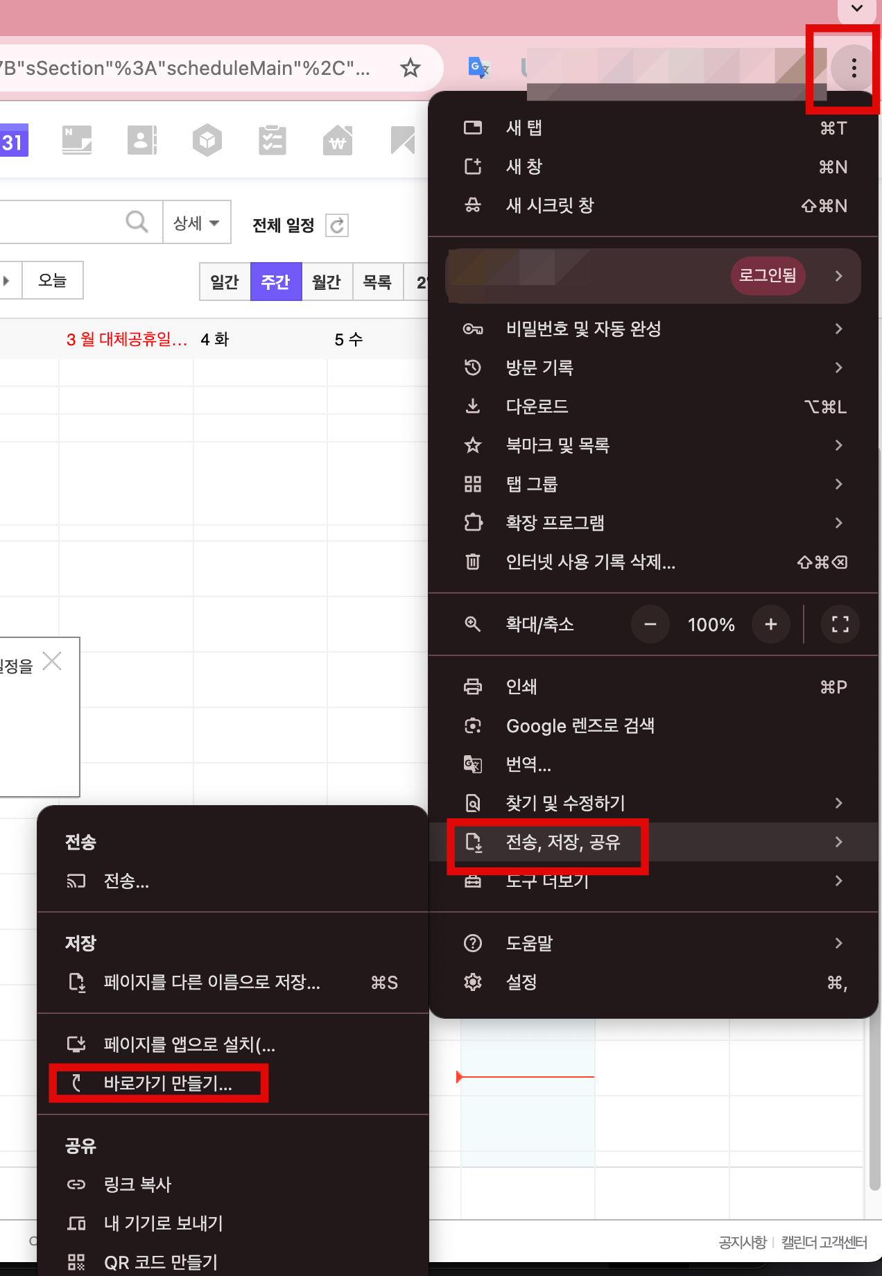 방법은 크롬 브라우저 상단 3점을 누릅니다. 그리고 '전송, 저장, 공유' 메뉴를 누르고 '바로가기 만들기'를 누르면 됩니다. 이제 거의 다 끝나가네요. ~~