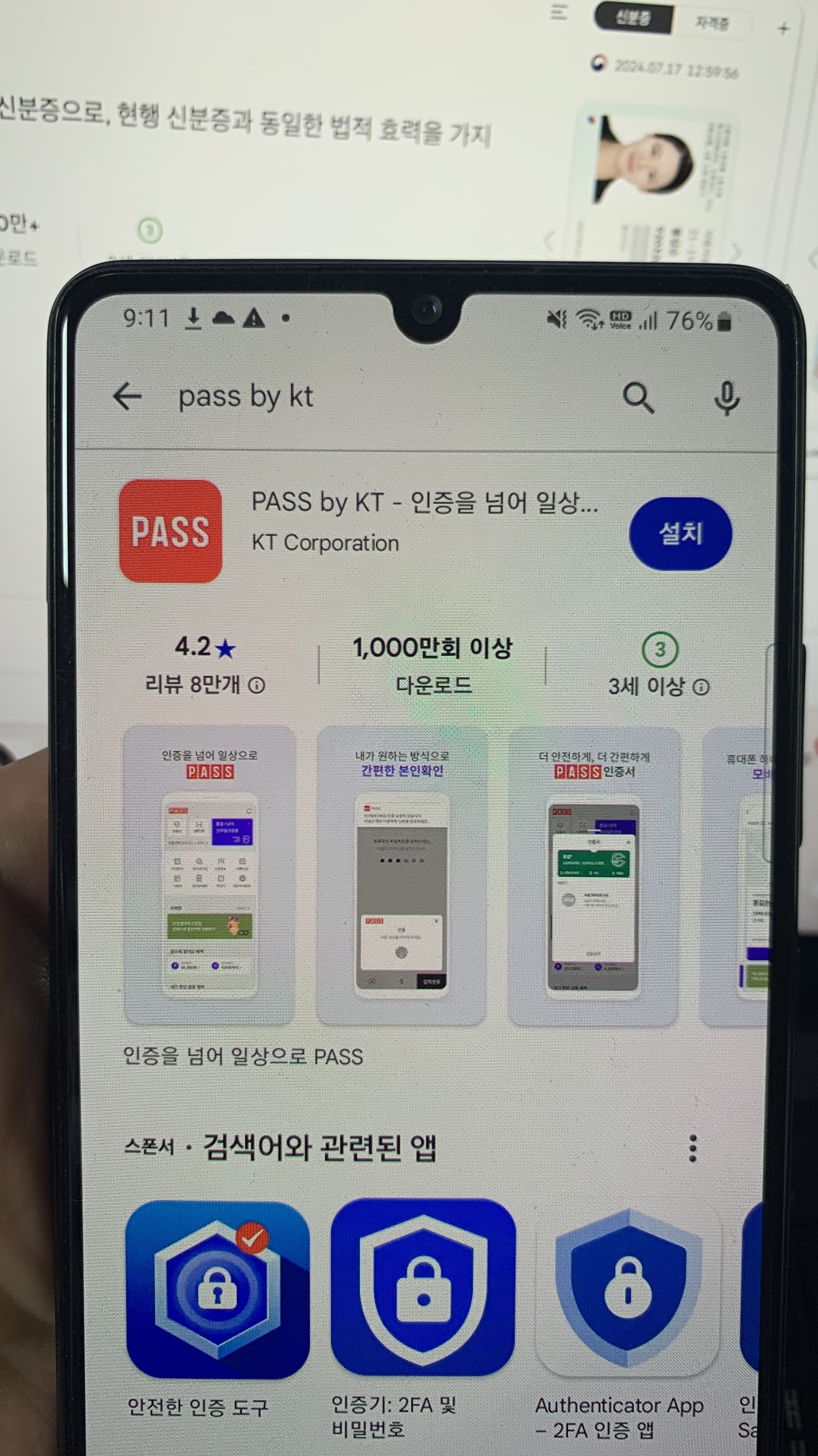 모바일 신분증 앱을 설치하기 위한 과정, 검색하는 화면 찍음