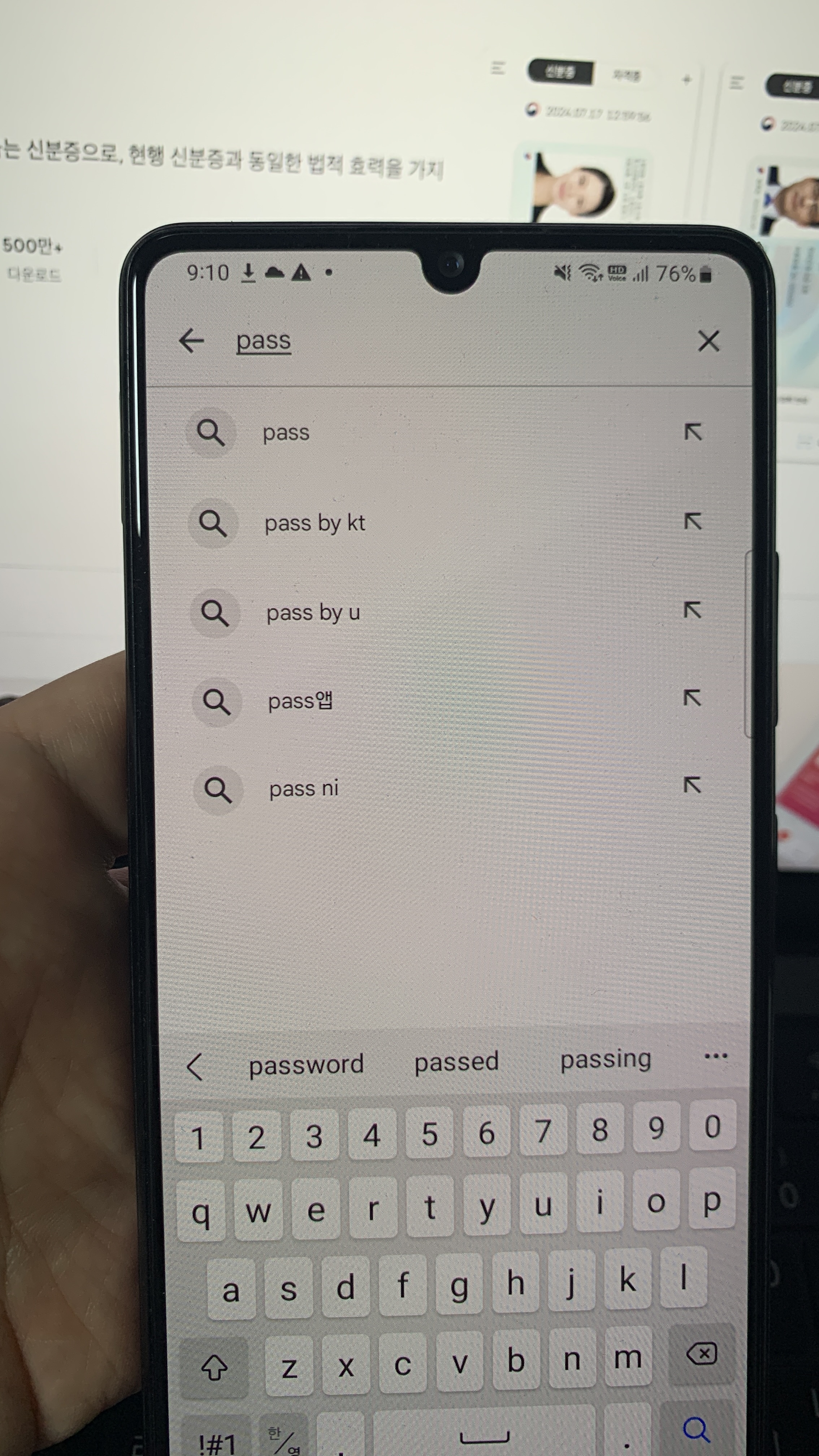 아래와 같이 pass 로 검색을 하면 이통사별로 pass 앱이 별도로 있다는 것을 확인하실 수 있습니다.