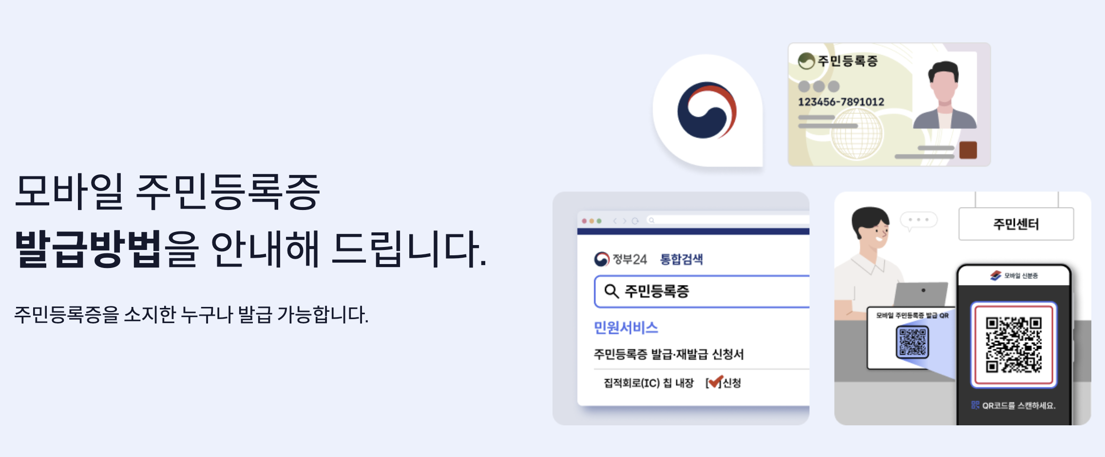 우선 주민센터(주민등록증) 및 운전면허시험장(운전명허증)을 모바일 신분증 앱에 담기 위해서는 현장 방문이 필요해요. 그리고 현장에서 QR발급 방식으로 실물 신분증 교체 없이 모바일 신분증 발급을 받을 수 있고요. 혹은 실물 신분증을 IC신분증으로 교체 발급받으신 다음에 스마트폰에 인식(태그)을 통해 모바일 신분증 앱에 직접 발급하는 방법으로 진행이 가능합니다.