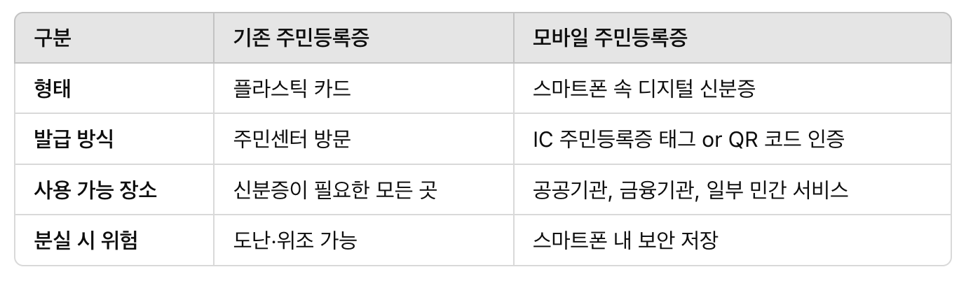 아래는 모바일 주민등록증과 기존 주민등록증 간의 차이점을 간단히 표로 나타내었습니다.