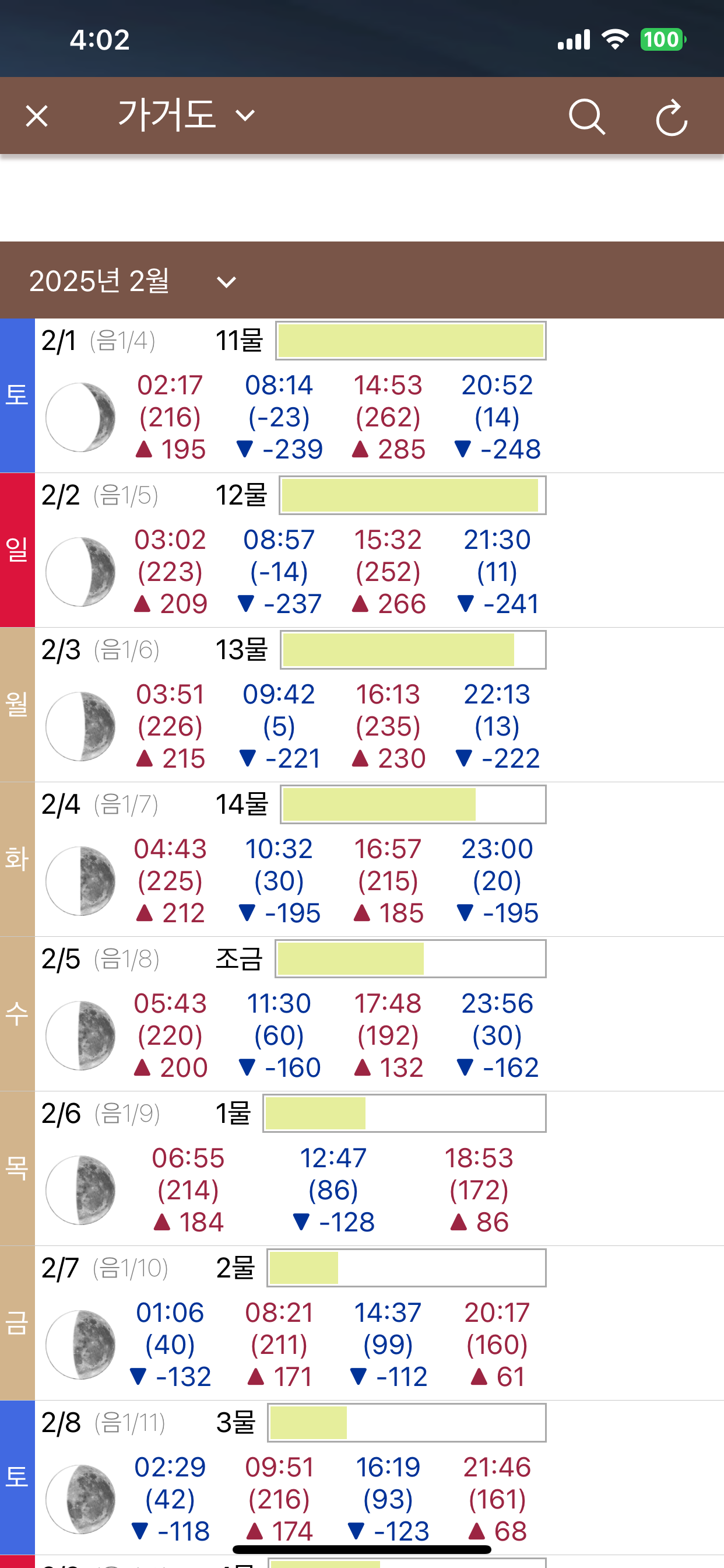 • 주간/월간 물때표: 앞으로의 조석 변화까지 예측 가능
