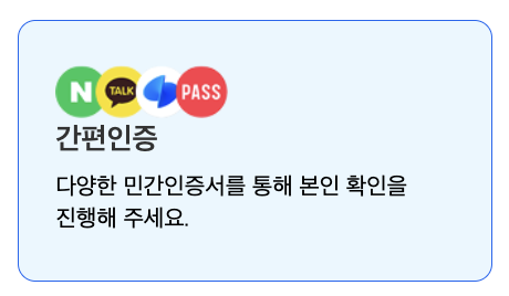 본인인증은 휴대폰인증, 간편인증, 금융인증서, 공동인증서를 지원하고 있습니다.