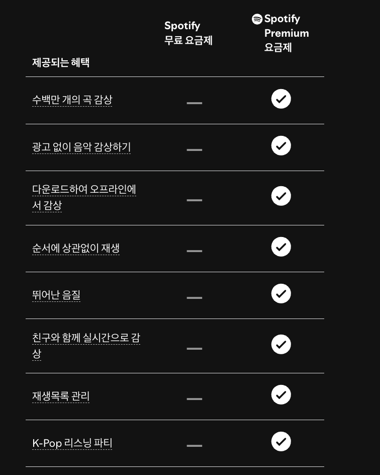 자문자답> 역시 구독 서비스군요. 중간에 광고도 있고, 프리미엄은 더 좋은 음질과 오프저장까지도 지원하는 형태이네요. 아래에 더 상세한 표가 있으니, 참고하셔요~