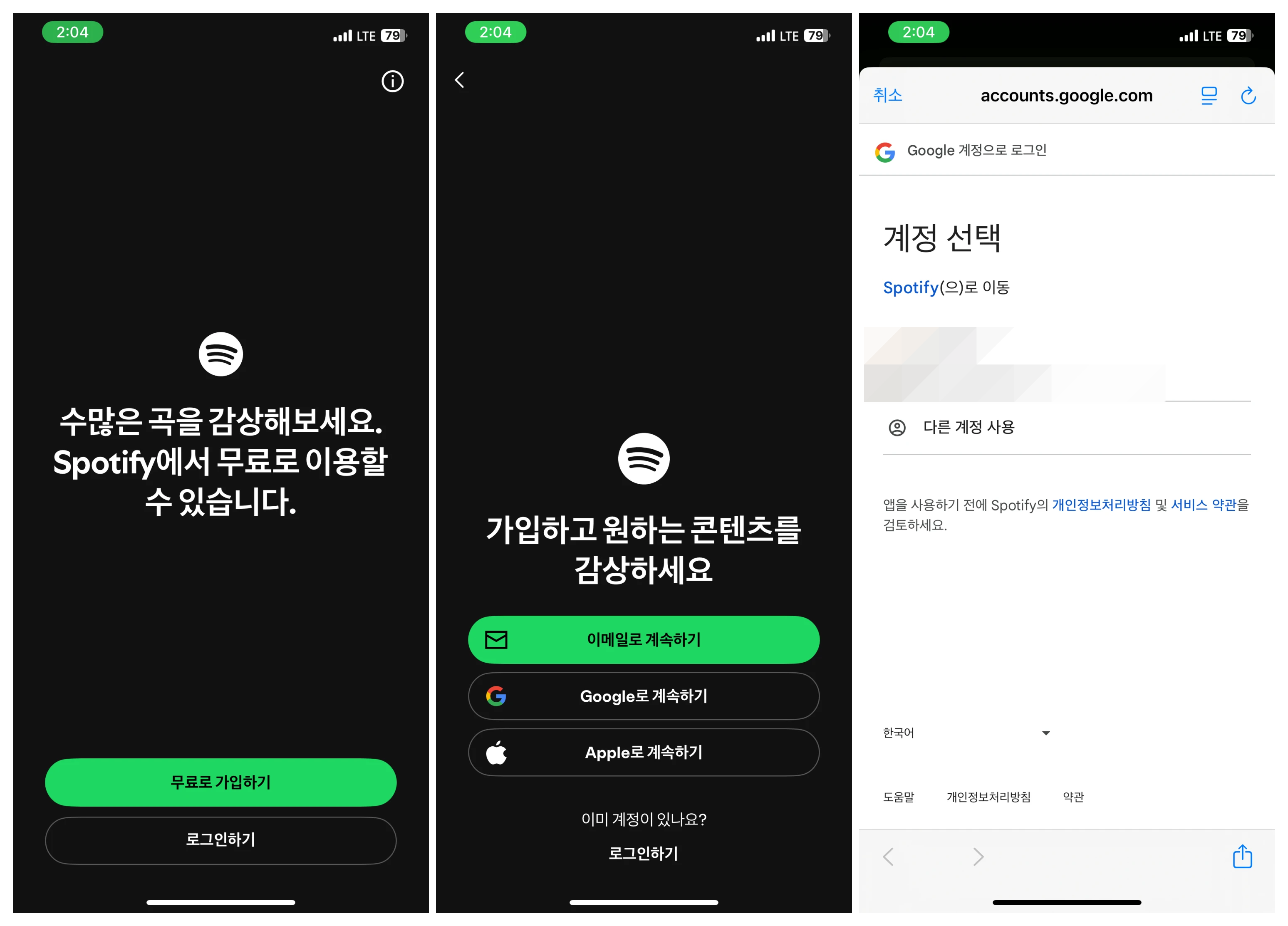 저는 구글 계정으로 간단히 스포티파이 오늘 회원가입 완료 했습니다.
