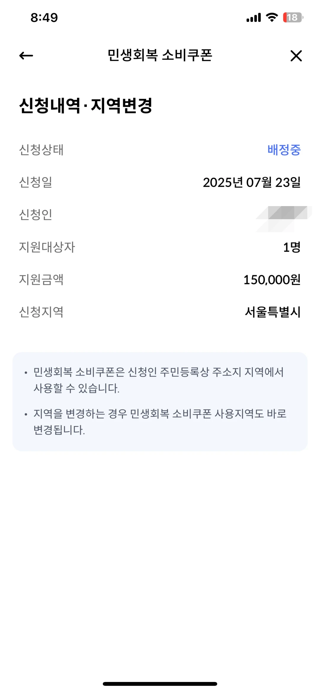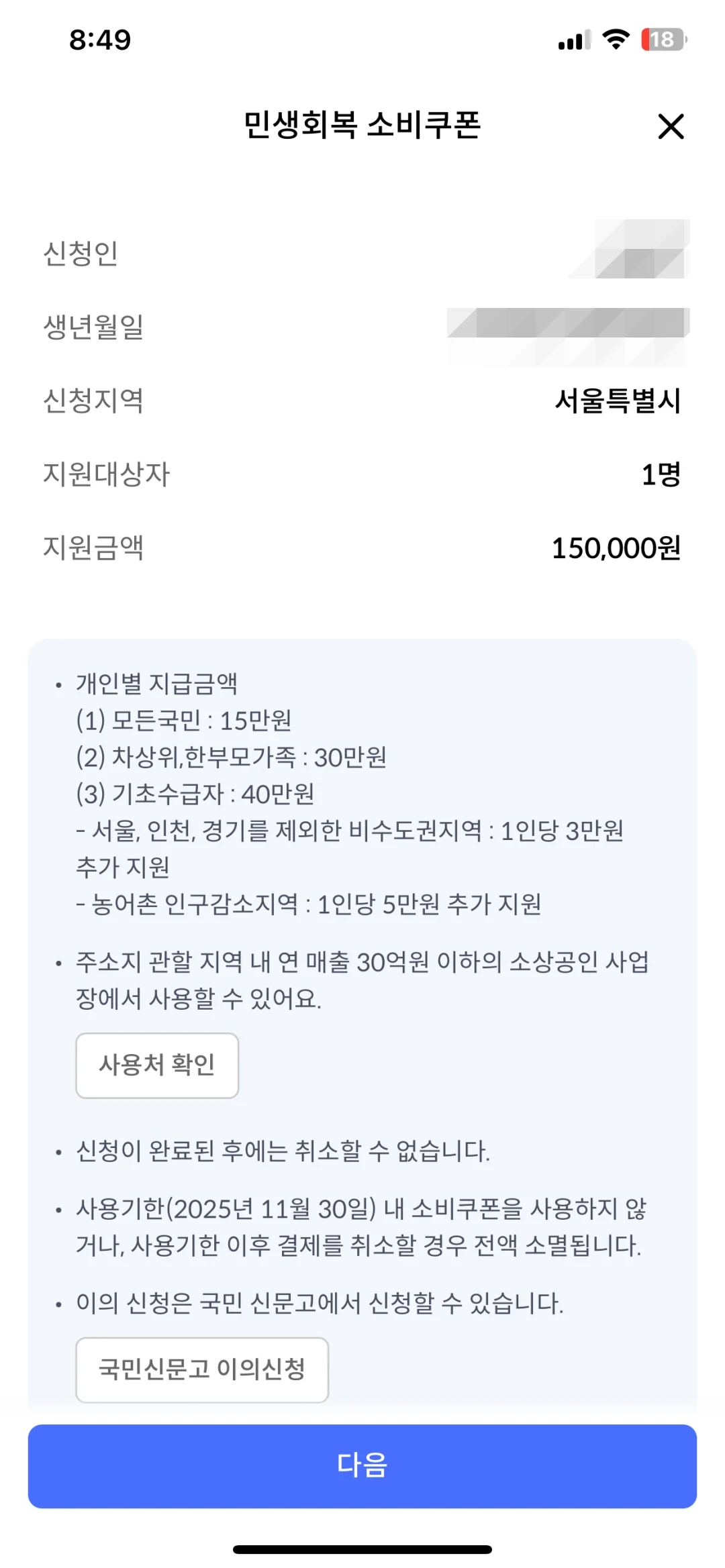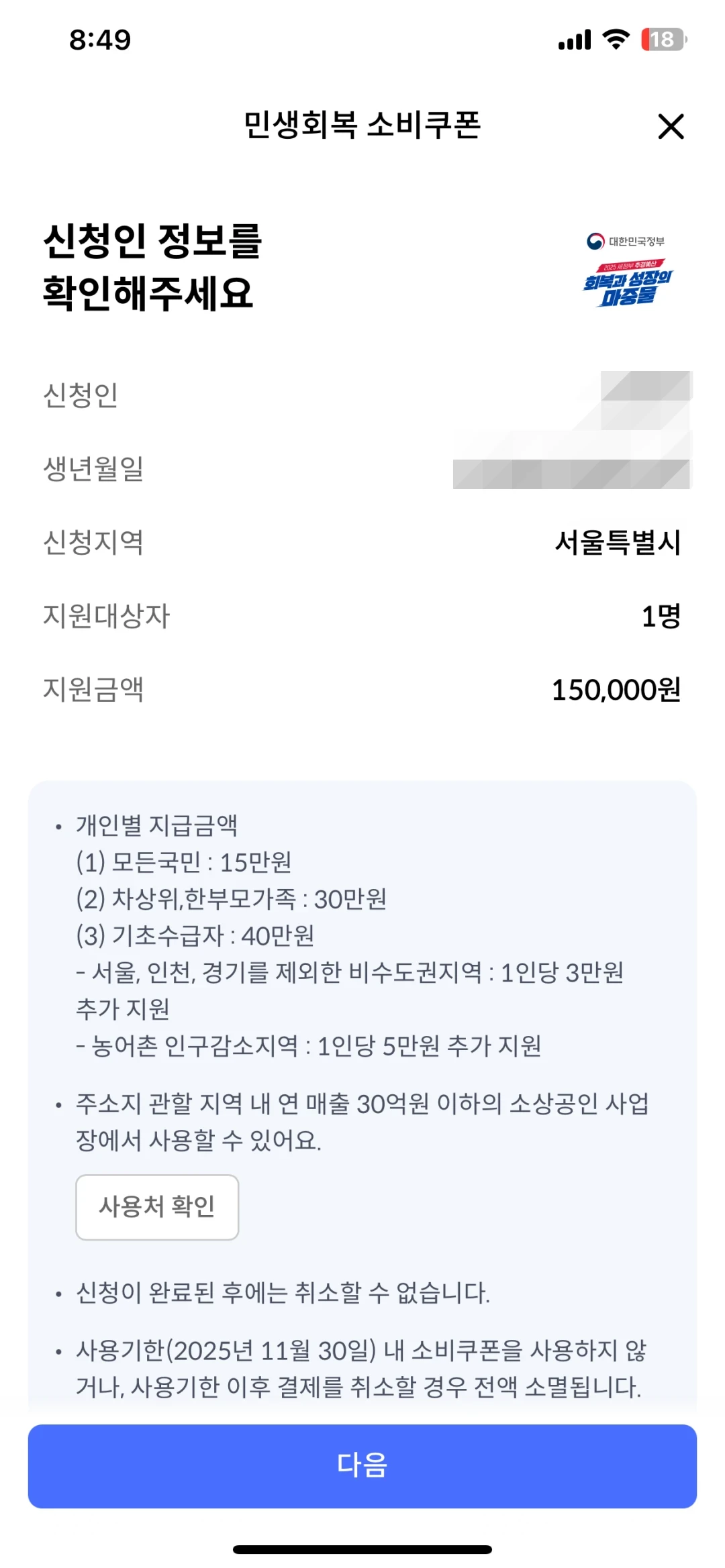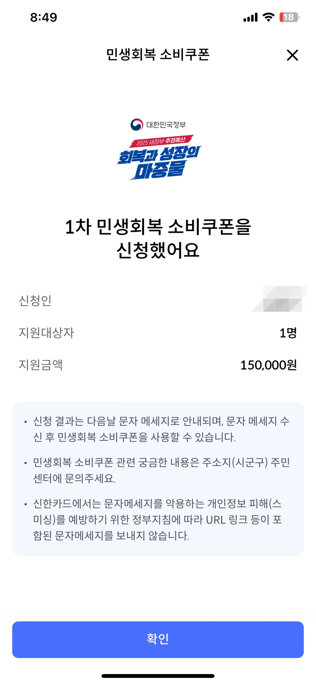 보시면 아시겠지만, 신청인 정보에 민생회복 소비쿠폰 지원금액이 표시가 됩니다.