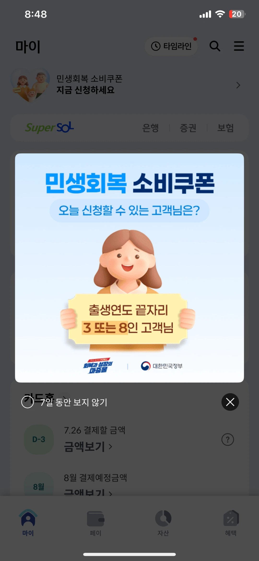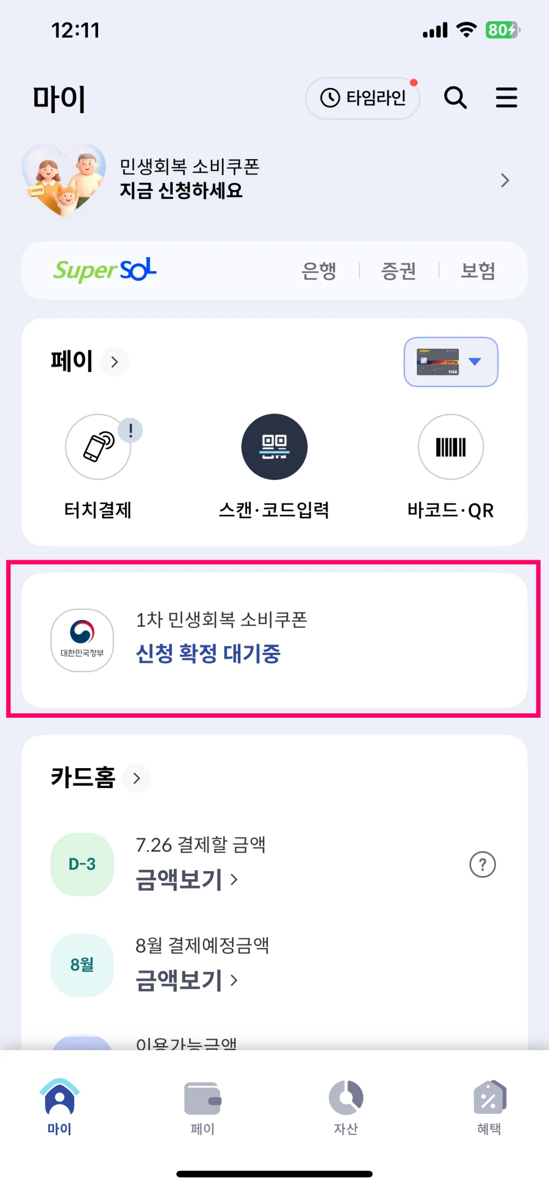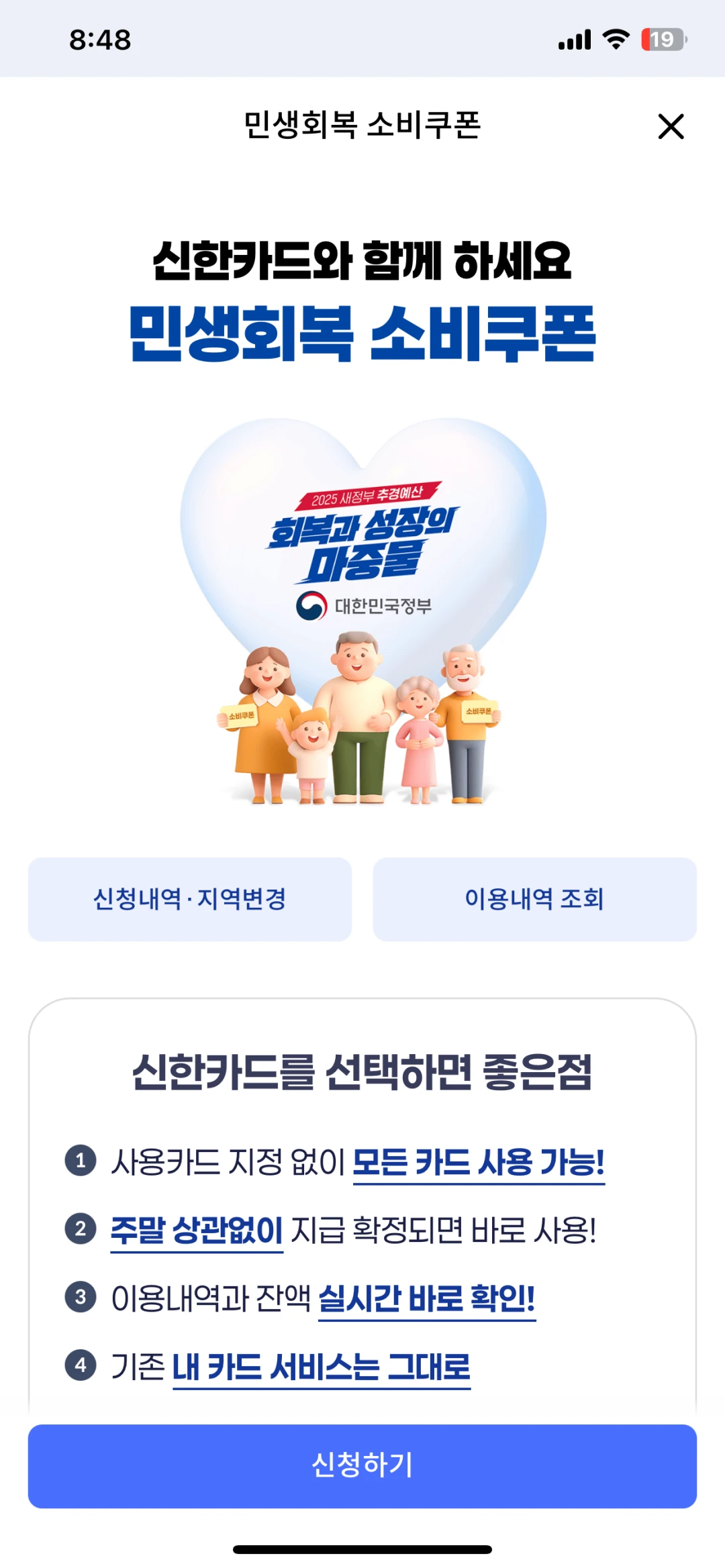 우리가 지금 신한카드 앱을 통해서 1차 민생회복 소비쿠폰을 신청했습니다.