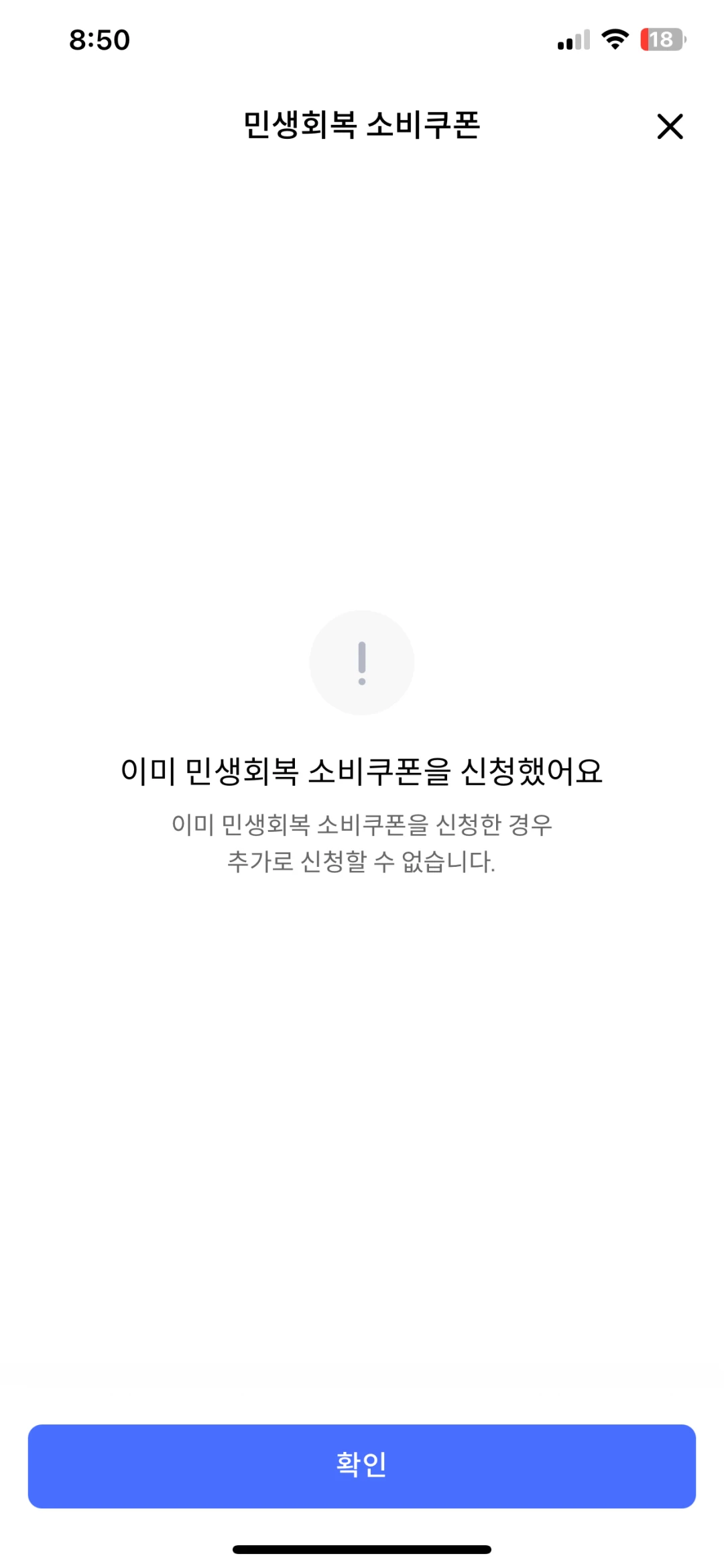 여기서 '신청하기'를 누르게 되면 1차 민생회복 소비쿠폰 신청이 완료됩니다.