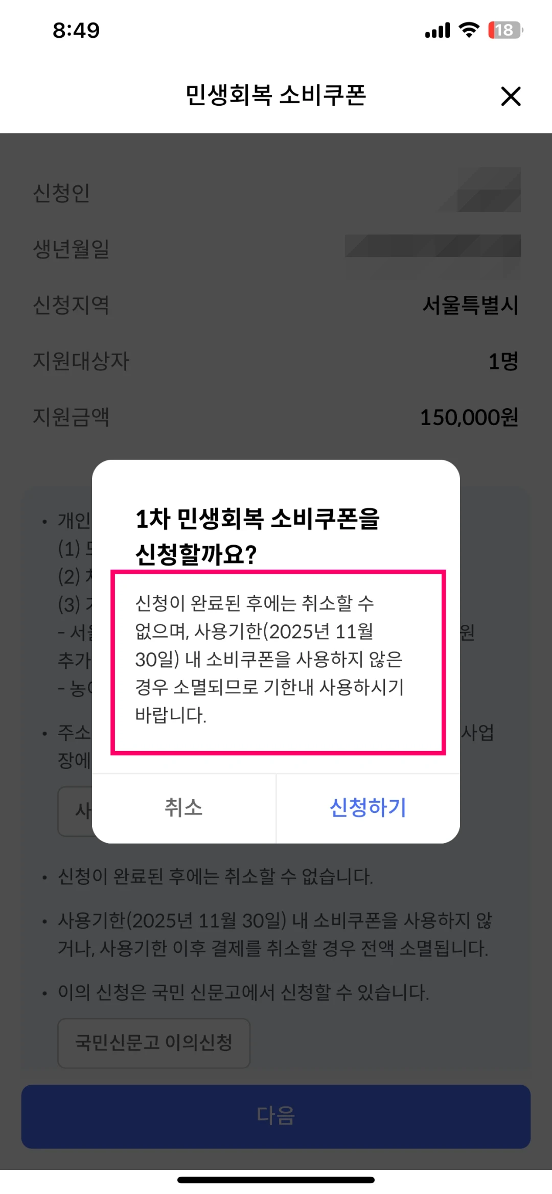 "신청이 완료된 후에는 취소할 수 없으며, 사용기한(2025년 11월 30일) 내 소비쿠폰을 사용하지 않은 경우 소멸되므로 기한 내 사용하시기 바랍니다."라는 내용입니다.