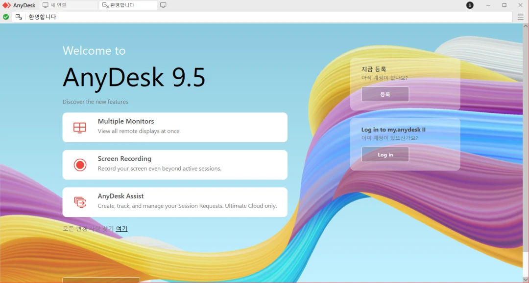 첨 실행하시면 '환영합니다' 탭 때문에 원격지 접속 ID가 보이지 않을 수 있어요. 애니테스크 어플리케이션 자체가 탭 기반으로 되어 있기 때문에 상단에 '새 연결'을 눌러 보시면 원격지 접속 ID를 바로 확인할 수 있습니다.