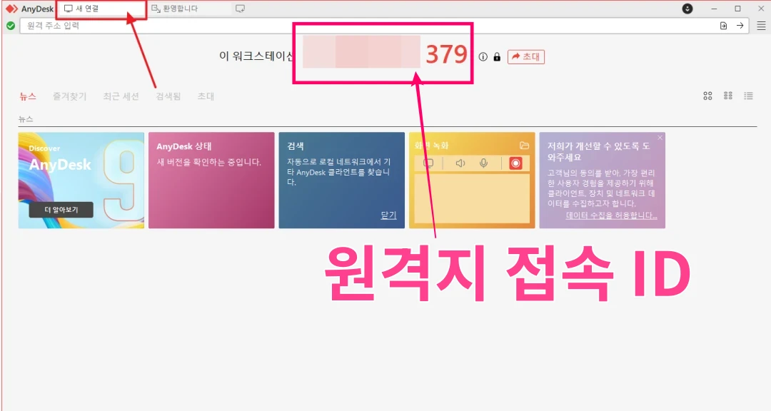첨 실행하시면 '환영합니다' 탭 때문에 원격지 접속 ID가 보이지 않을 수 있어요. 애니테스크 어플리케이션 자체가 탭 기반으로 되어 있기 때문에 상단에 '새 연결'을 눌러 보시면 원격지 접속 ID를 바로 확인할 수 있습니다.