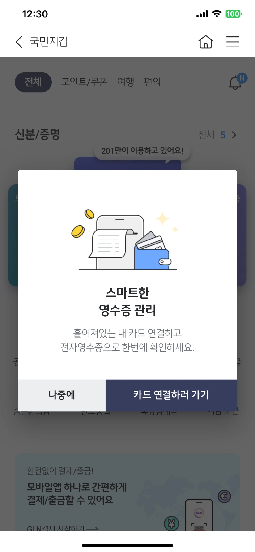 예전에는 국민지갑이라고 되어 있었지만, 이번에 앱 업데이트 이후에는 '지갑'이라고 메뉴 이름 변경은 물론 위치까지도 중앙으로 변경되었네요. 지갑을 누르게 되면 '국민지갑'화면으로 이동하게 됩니다.