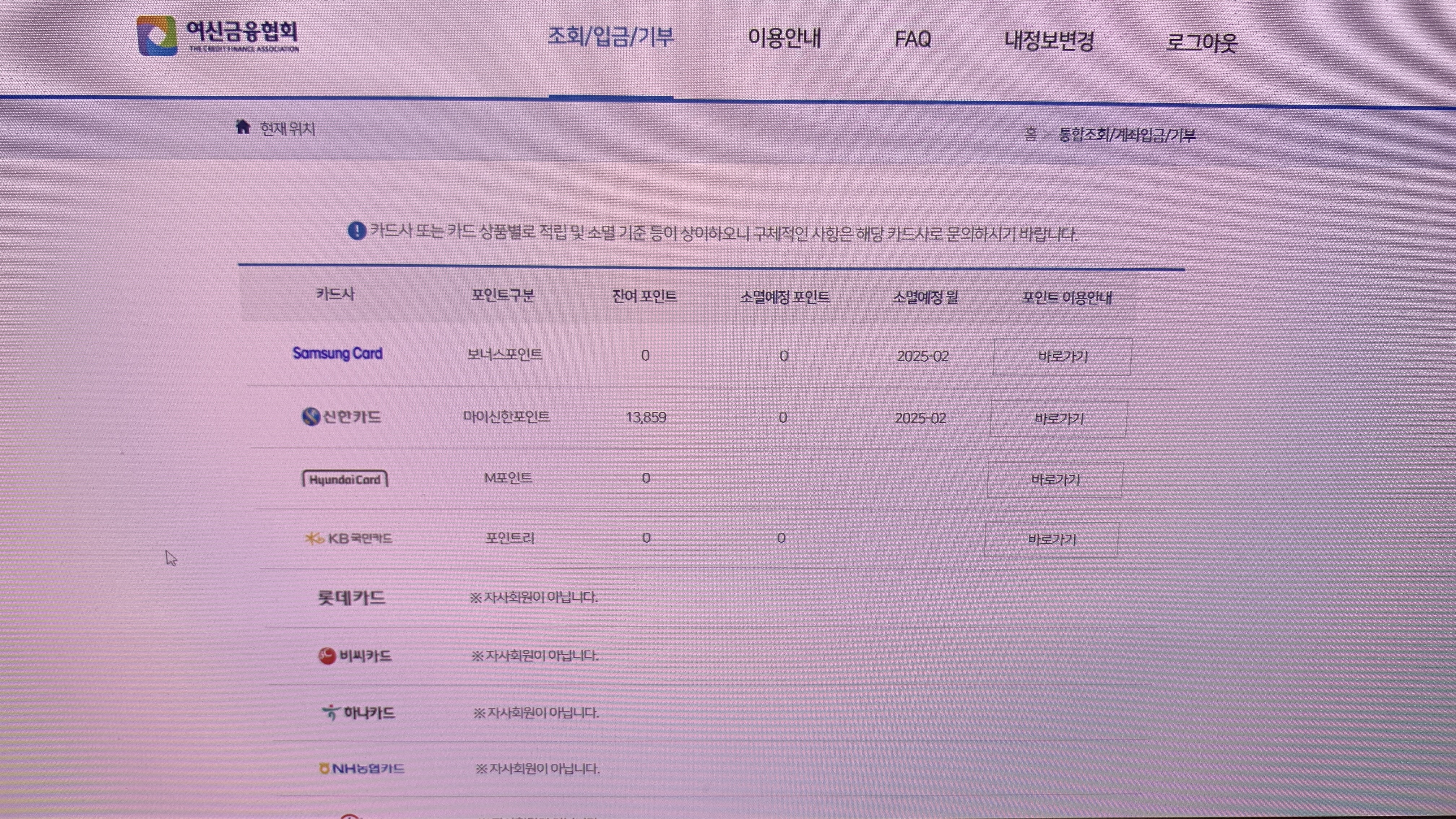 pc에서 확인한 카드포인트 여신금융협회 카드포인트 통합조회 화면
