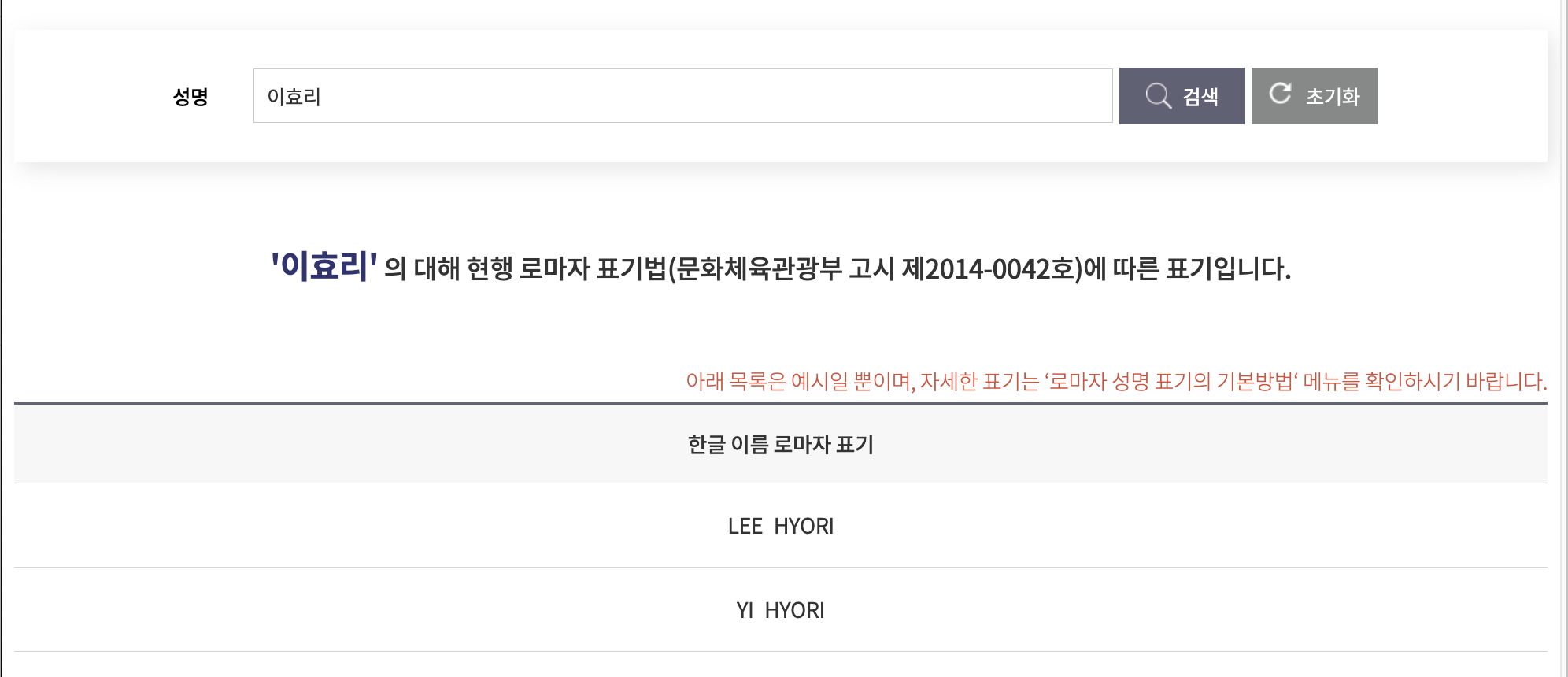 다른 곳에서는 I HYORI로 표기를 했었는데요. 외교부 추천 로마자 성명 검색에서는 YI (와이아이)로 표기해 줍니다. 조금 다르네요.
