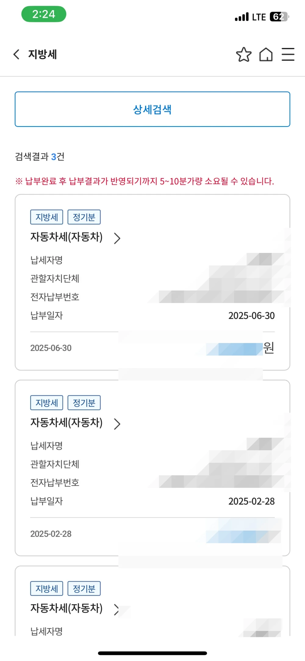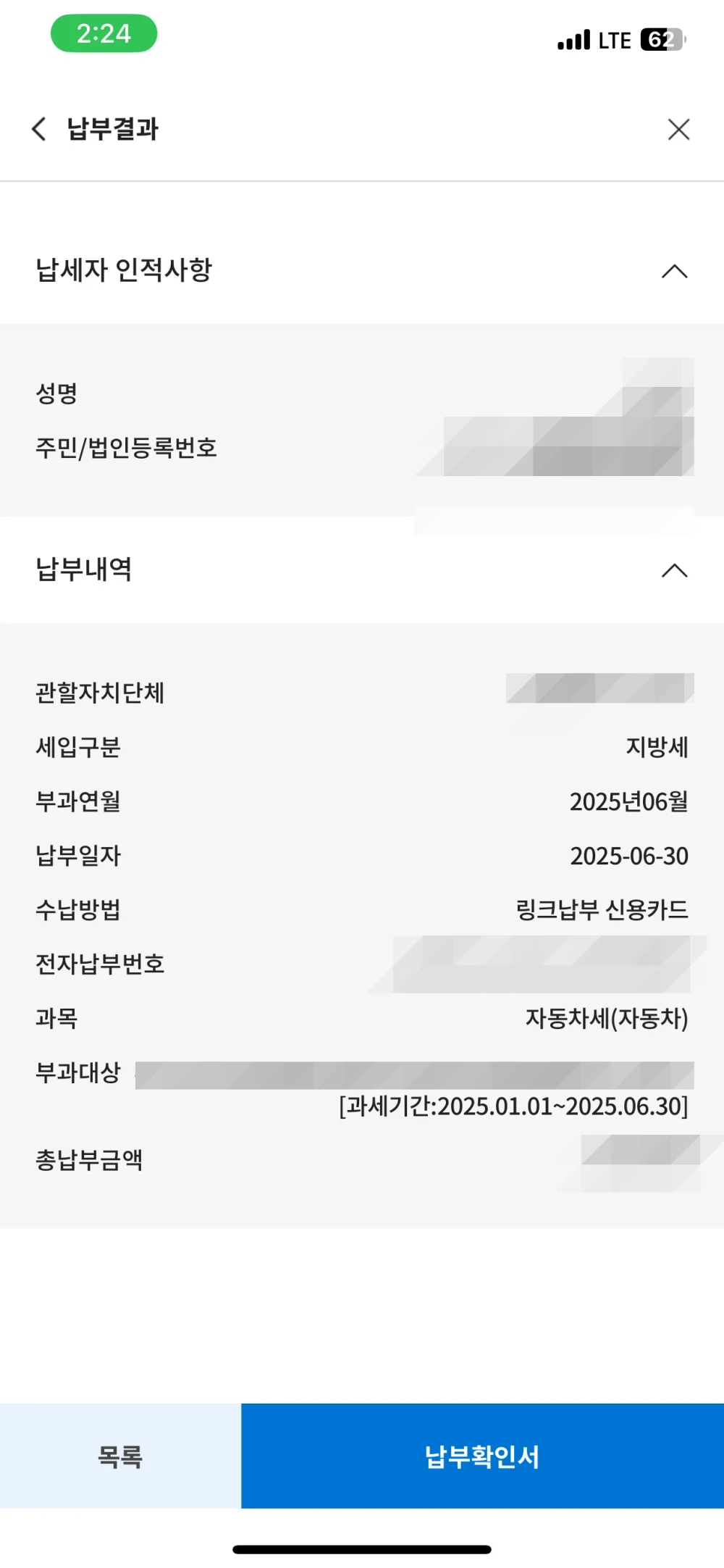 11. 자동차세 6월 납부 내역 확인, 완료했습니다.