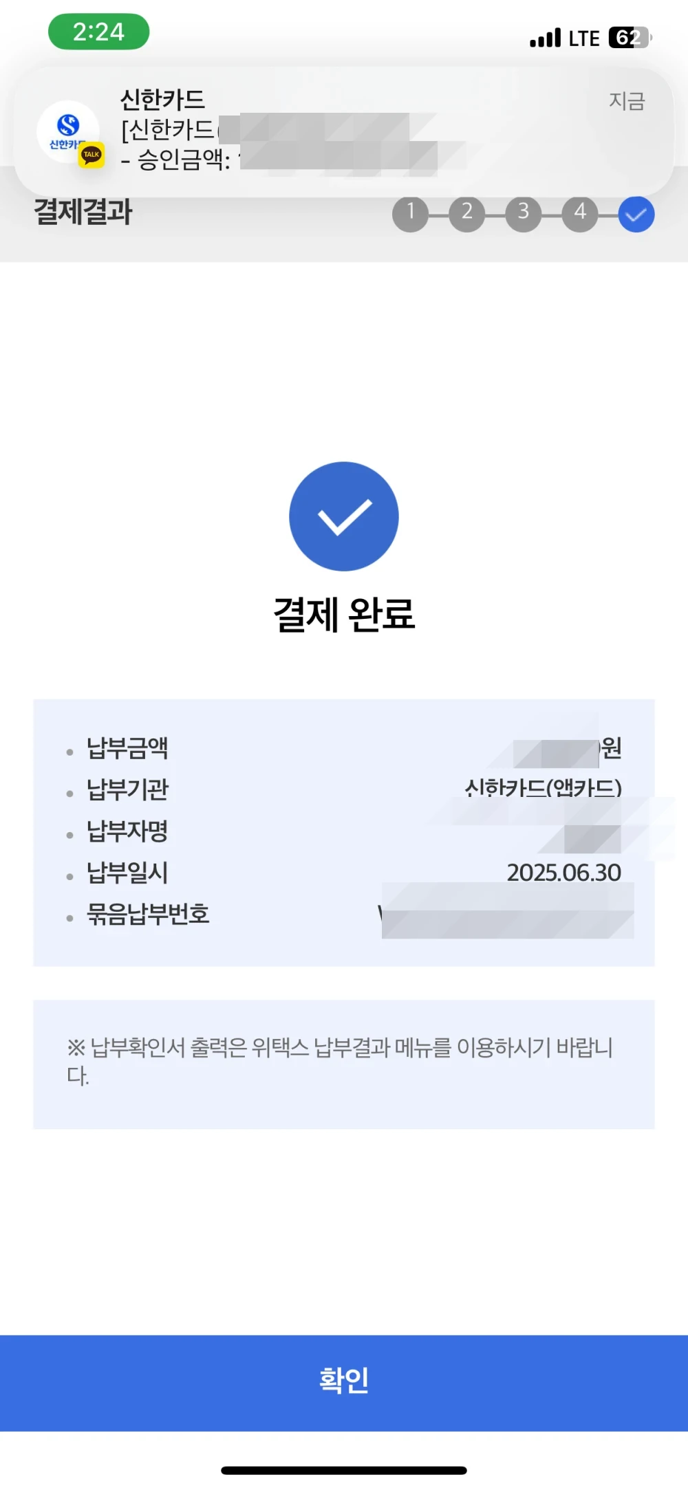 납부완료 후 납부결과도 확인할 수 있습니다.