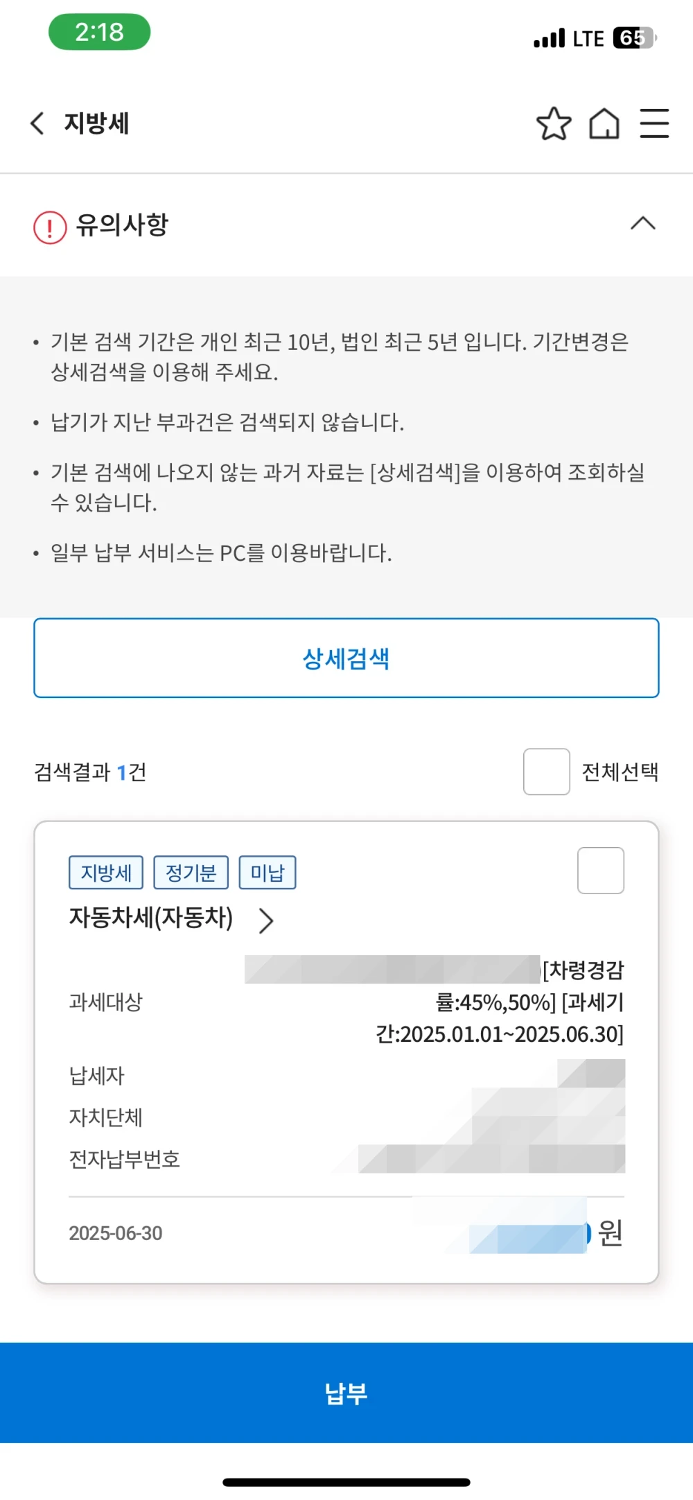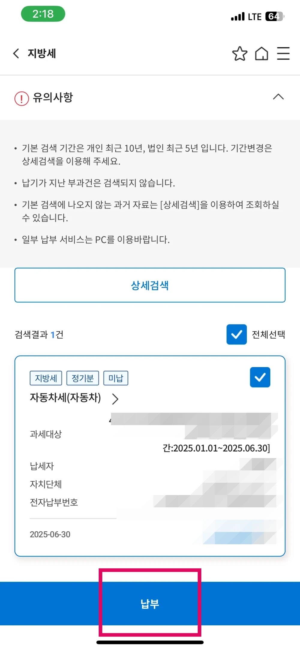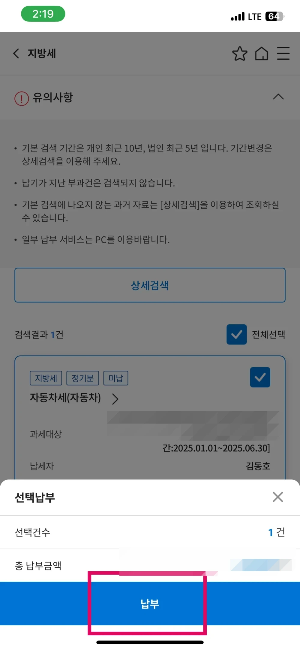 4. 자동차세 내용을 확인하시고 '납부'를 눌러 주세요.