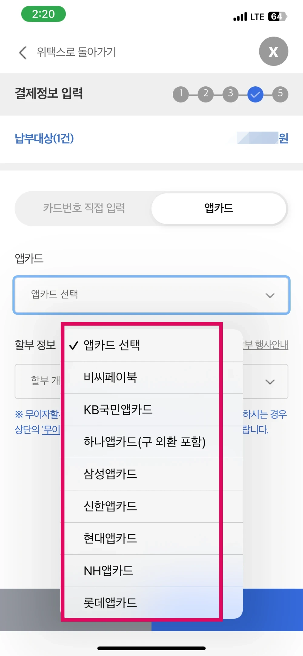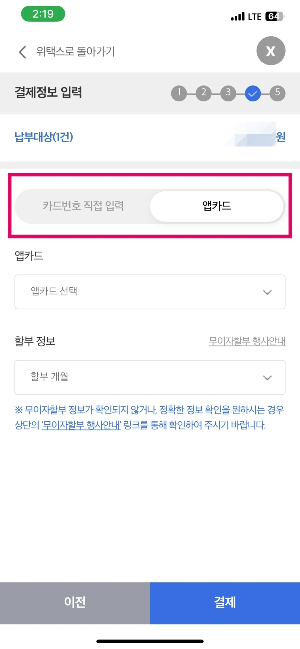 9. 카드번호 혹은 앱카드를 선택 후 할부 정보가지 선택합니다.