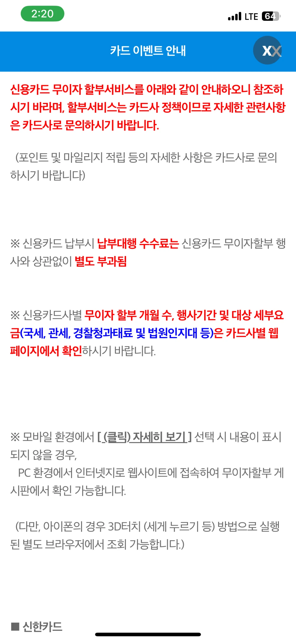 신한카드, 삼성카드, 하나카드 등을 눌러봤더니 해당 카드사로 이동이 되고 '이벤트' 페이지 쪽에서 아무래도 확인이 가능한 듯합니다. 이 부분 참고하셔서 무이자 충분히 누려 보시기 바랍니다.