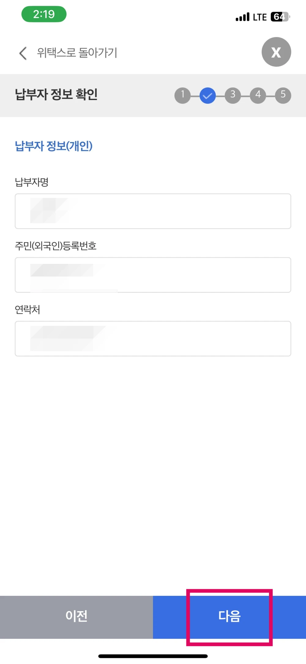 7. 납부자 정보를 입력후 '다음'을 눌러 주세요.
