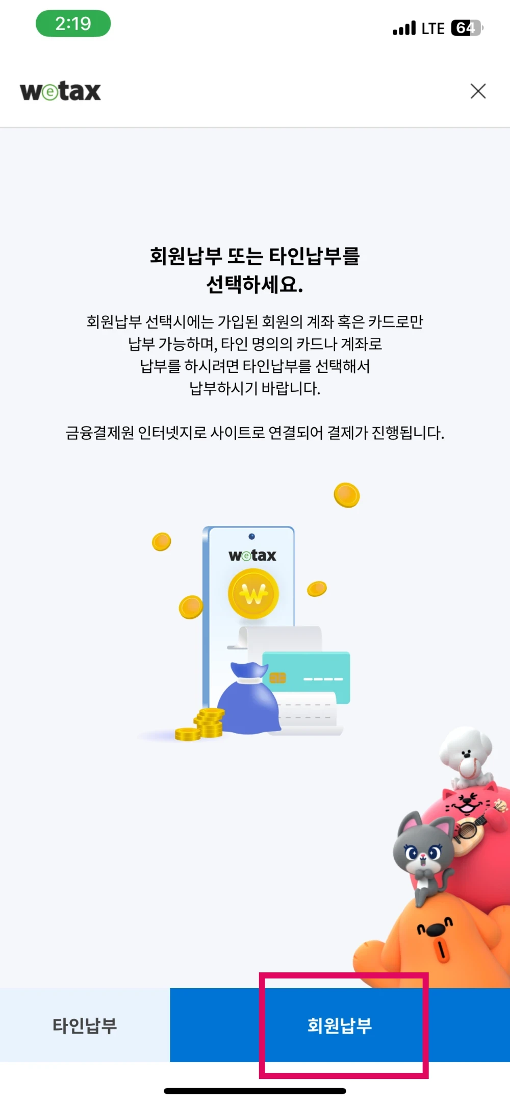 여기서 만약 다른 분 명의로 납부를 원하신다면 '타인납부'를 눌러 주세요.