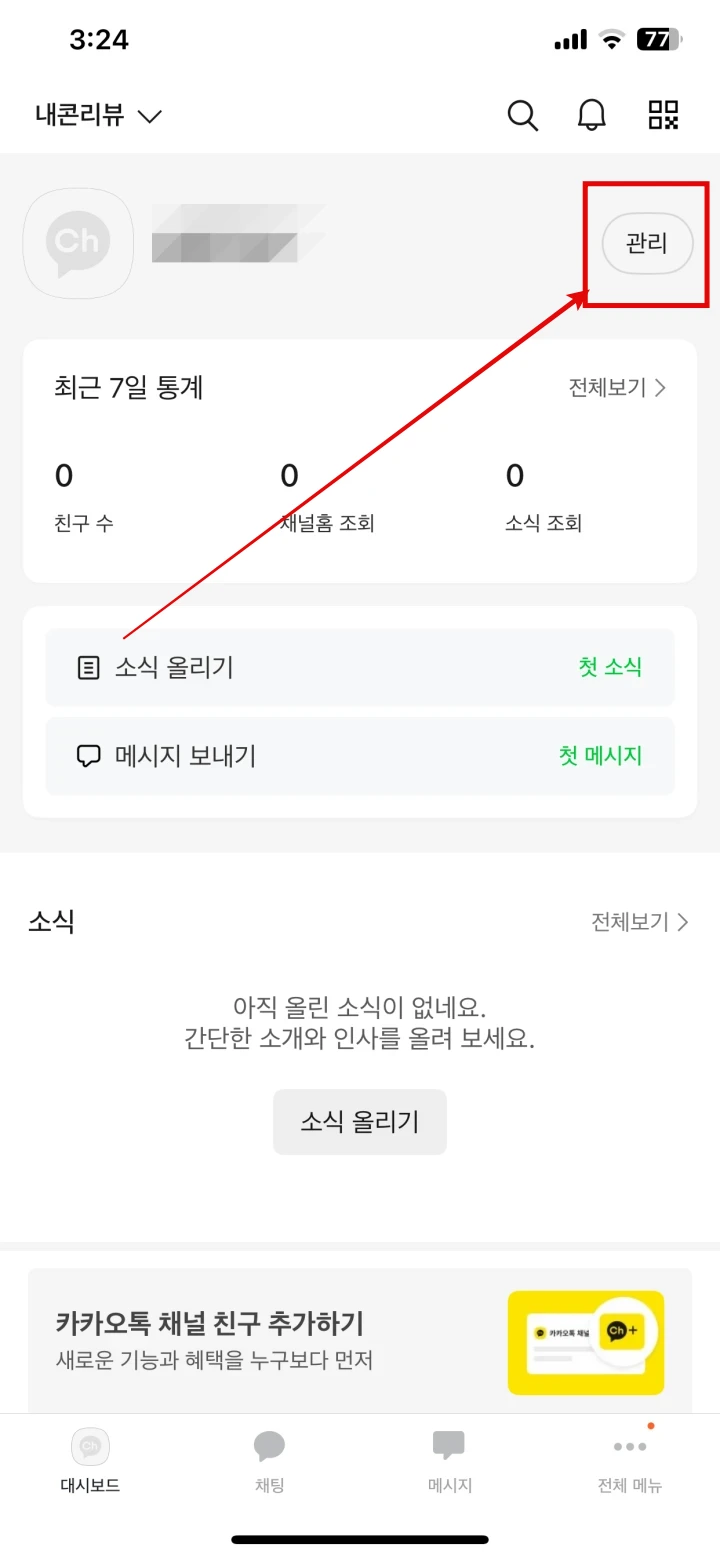 2. 채널 홈 > 우상단 '관리'를 터치해 주세요.