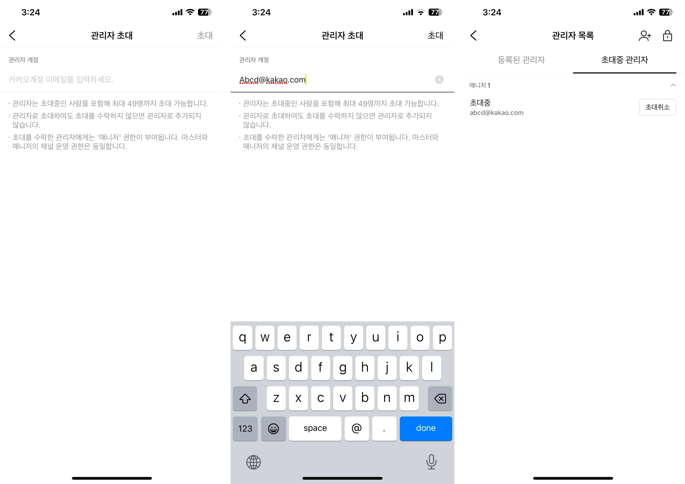 카카오톡 채널 마스터가 관리자를 초대하게 되면 매니저를 모시는 것인데요.