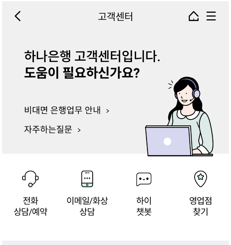 하나은행 앱을 설치하시면 전체 메뉴 화면에서 상단에 고객센터를 확인하실 수 있으셨을 거예요.