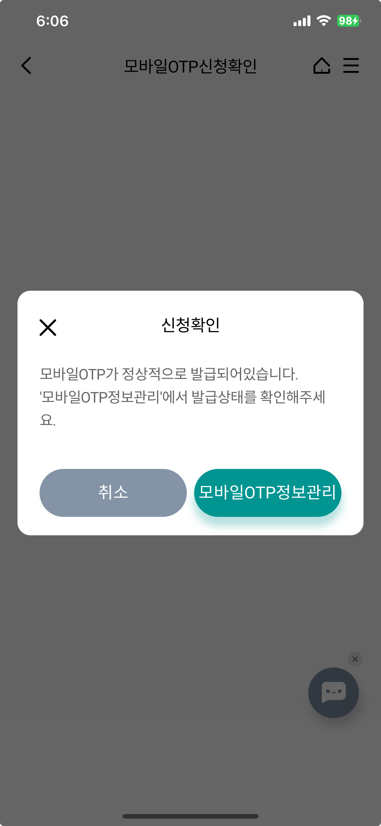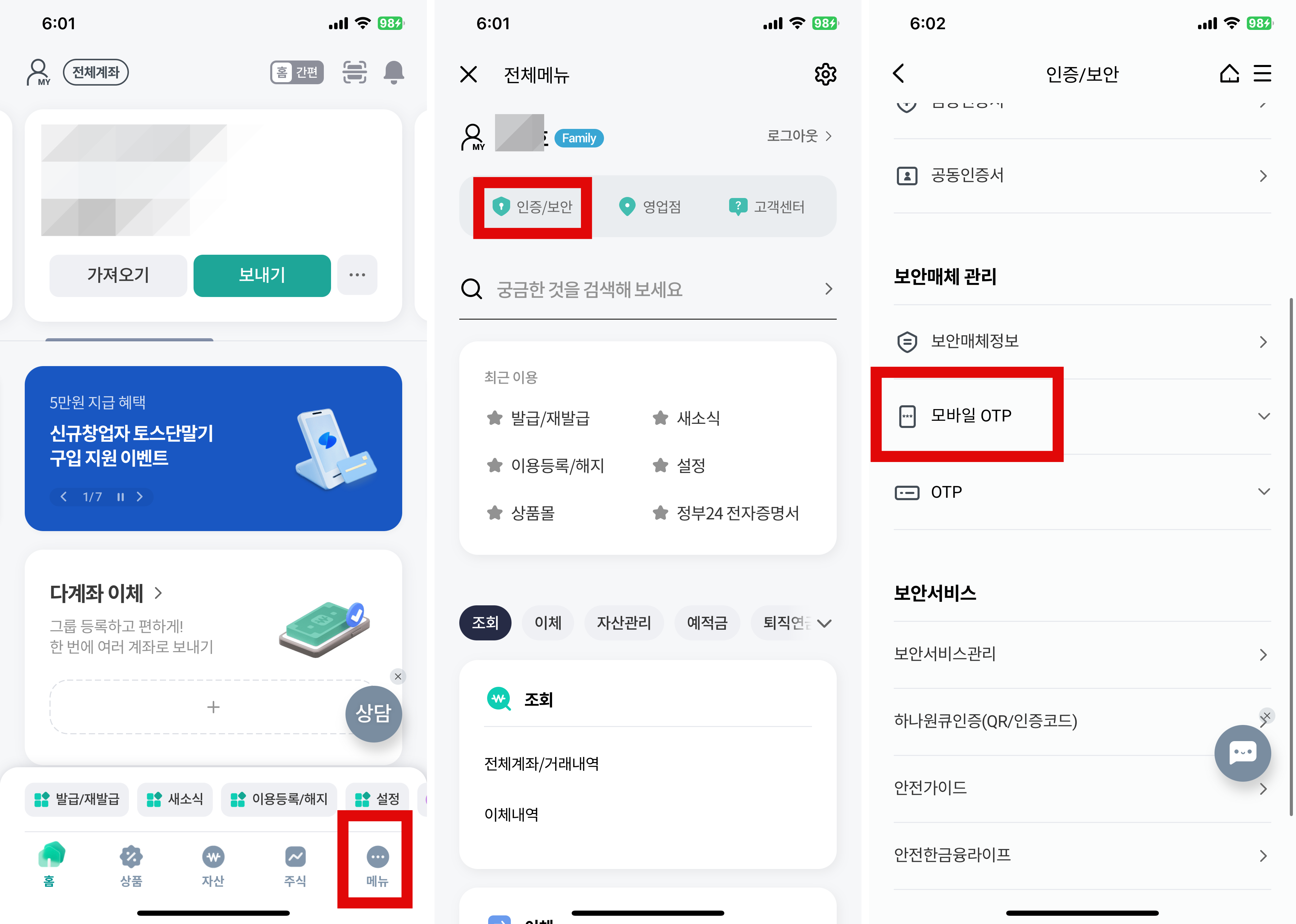 - '모바일 OTP' → 발급/재발급을 눌러 주세요.