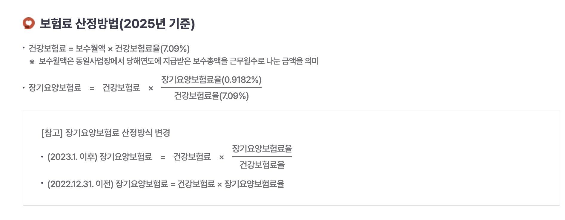 아래는 건강보험료와 장기요양보험료의 2025년 기준으로 산정하는 방식을 보여주는 그림입니다. 2023년 이후부터 장기요양보험료의 산정하는 방식이 변경된 것도 함께 확인하실 수 있습니다.