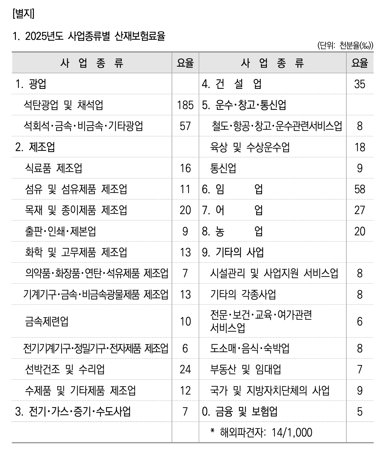2025년 산재보험료율표에서 일부 발췌하였는데요. 아래와 같이 사업종류별로 요율이 상이한 것을 보실 수 있습니다. 광업, 제조업, 전기 가스 증기 수도사업, 건설업, 운수 창고 통신업, 임업, 어업, 농업, 기타의 사업에 따라서 달라짐을 보실 수 있으며, 보다 상세한 내용이 필요하시면 아래 2025년 요율표를 첨부하니 참고하시기 바랍니다.